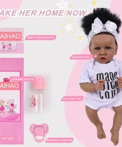 Muñeca de 22 pulgadas (tamaño de recién nacido) con cuerpo suave y realista. La muñeca viene con ropa como se muestra en la imagen (0-3 meses). Peso de 1.3 kg con cabeza y extremidades de silicona suave y cuerpo de tela gruesa para una sensación de muñeca real. Los brazos y piernas se pueden mover arriba y abajo, y la muñeca puede sentarse y acostarse. Incluye botella, chupete, certificado de nacimiento, ropa y caja de regalo. Cumple con los requisitos de seguridad de ASTM F963 y EN71. Ideal como regalo de vacaciones, regalo de cumpleaños o muñeca de compañía para abuelos.