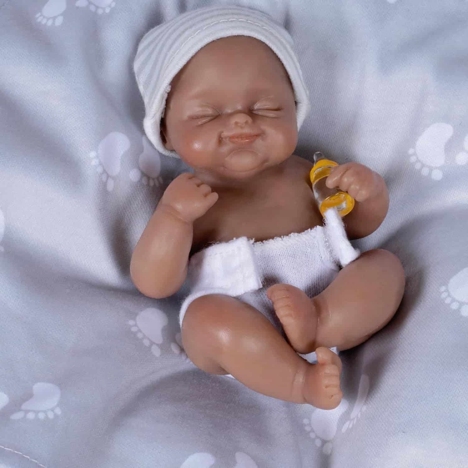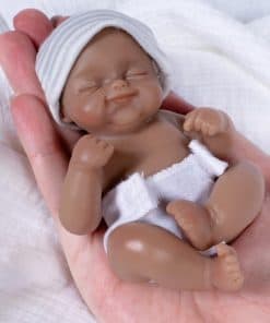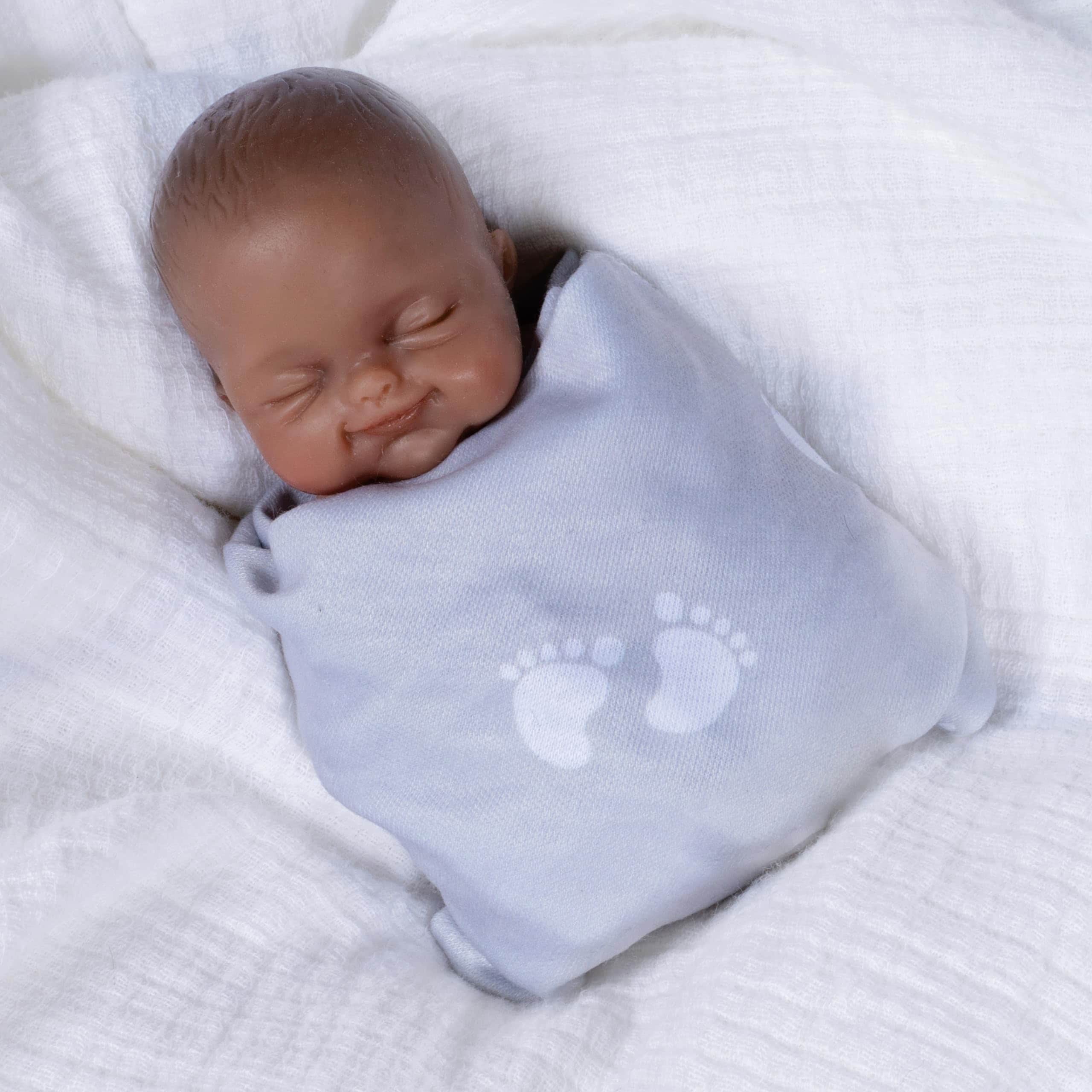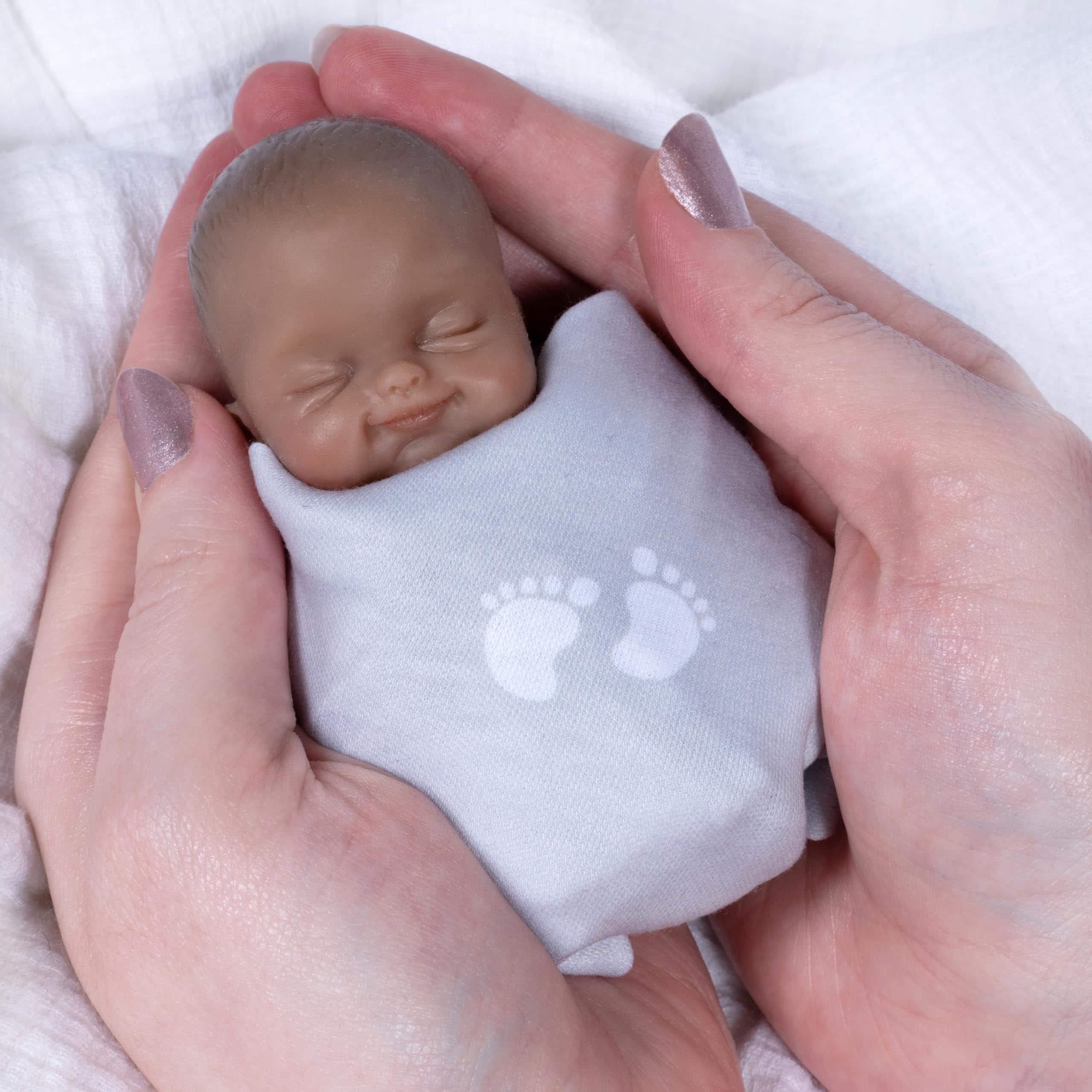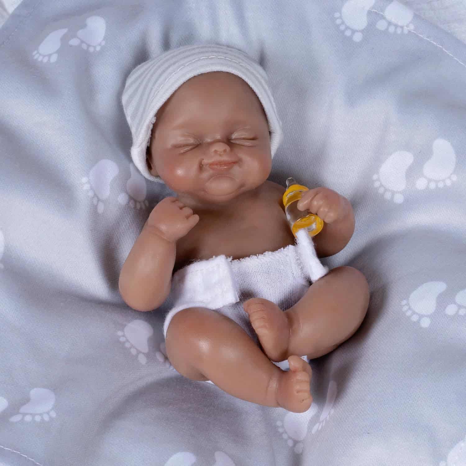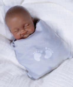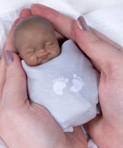 Muñeca realista para bebé recién nacido de Paradise Galleries, diseñada por el escultor y artista Ping Lau. Esta muñeca de colección de 5″ está fabricada con silicona SilkTouch y es ideal para coleccionistas de muñecas Reborn a partir de 3 años. Viene acompañada de una manta gris impresa, un gorro a rayas blancas y grises, un pañal blanco y una mini botella amarilla. Presenta cabello castaño claro pintado a mano y un tono de piel oscuro ideal para un aspecto realista. Esta muñeca es un regalo especial de cumpleaños perfecto para cualquier niño pequeño.