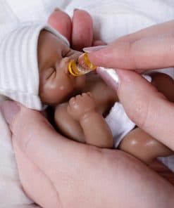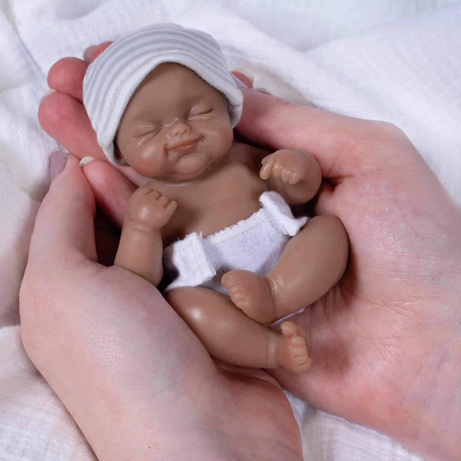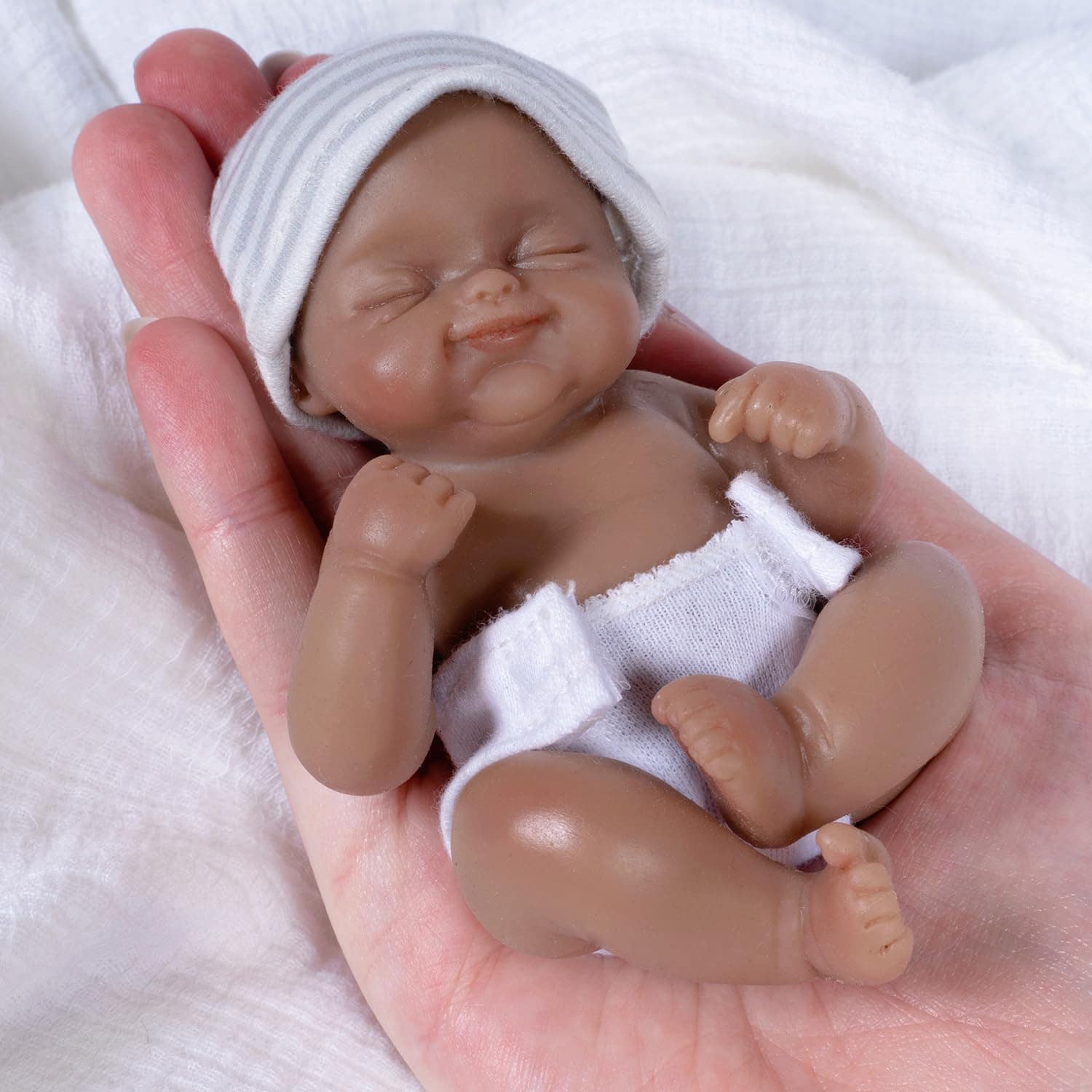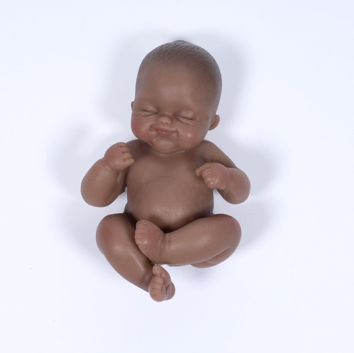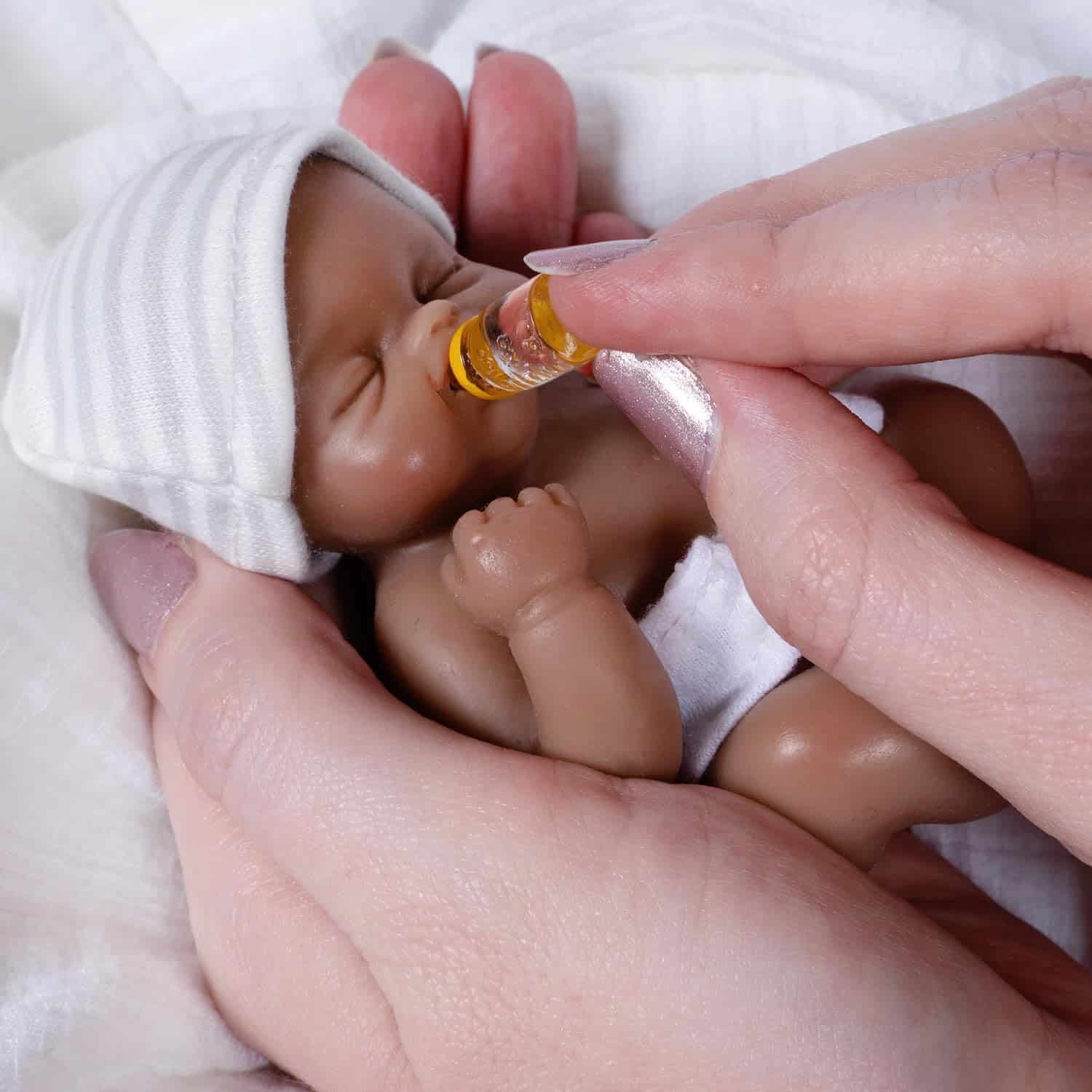 Muñeca realista para bebé recién nacido de Paradise Galleries, diseñada por el escultor y artista Ping Lau. Esta muñeca de colección de 5″ está fabricada con silicona SilkTouch y es ideal para coleccionistas de muñecas Reborn a partir de 3 años. Viene acompañada de una manta gris impresa, un gorro a rayas blancas y grises, un pañal blanco y una mini botella amarilla. Presenta cabello castaño claro pintado a mano y un tono de piel oscuro ideal para un aspecto realista. Esta muñeca es un regalo especial de cumpleaños perfecto para cualquier niño pequeño.