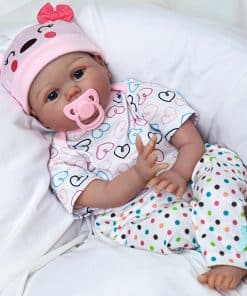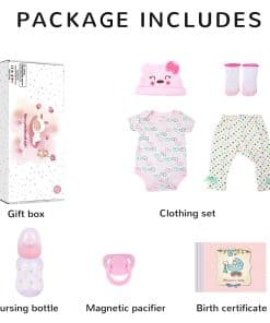 CHAREX se dedica a compartir Amor y Alegría con los amantes de las muñecas de todo el mundo. Nuestros diseñadores capturan su inspiración de todas las partes de nuestra vida: compañía, amistades, recuerdos de la infancia y familia. Esperamos que cada muñeca traiga felicidad a tu hogar. Trabajamos con diseñadores célebres para crear muñecas únicas, preciosas y adorables que calentarán tu corazón, avivarán tu espíritu y nutrirán tu alma, y nuestra muñeca cumple con los requisitos de seguridad de ASTM F963 y EN71 para edades de 3+, somos responsables de la seguridad y salud de cada niño. Características del producto Tamaño: 22 pulgadas/55 cm, de la cabeza a los pies Peso: Aprox. 1.8 kg/3.9 lb Material: Cabeza y Brazos y Piernas: Silicona; Cuerpo: tela de algodón suave. Ojos: ojos acrílicos azules aplicados a mano, que no se cierran. Color de pelo: peluca marrón oscuro Paquete 1 muñeca con ropa 1 chupete magnético 1 biberón 1 certificado de nacimiento 1 jirafa rosa 1 caja de regalo Nota (Cabeza y brazos y piernas de silicona) Se puede lavar con una toalla húmeda.