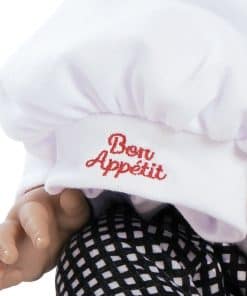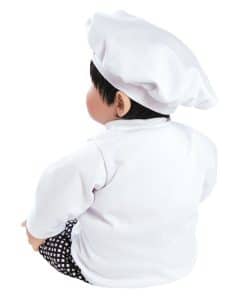 4. Incluye un abrigo de chef blanco con cierres frontales de broche, un sombrero de chef a juego y un par de pantalones a cuadros en blanco y negro.
