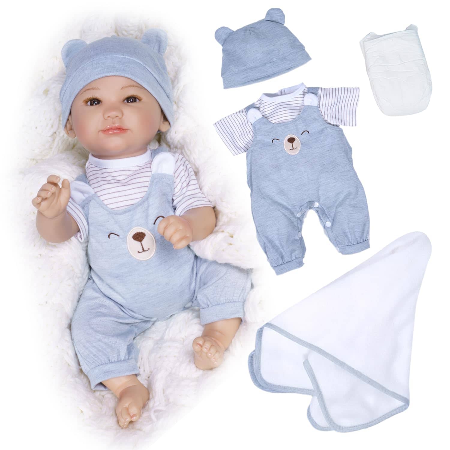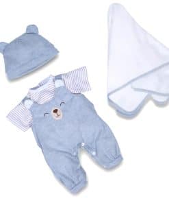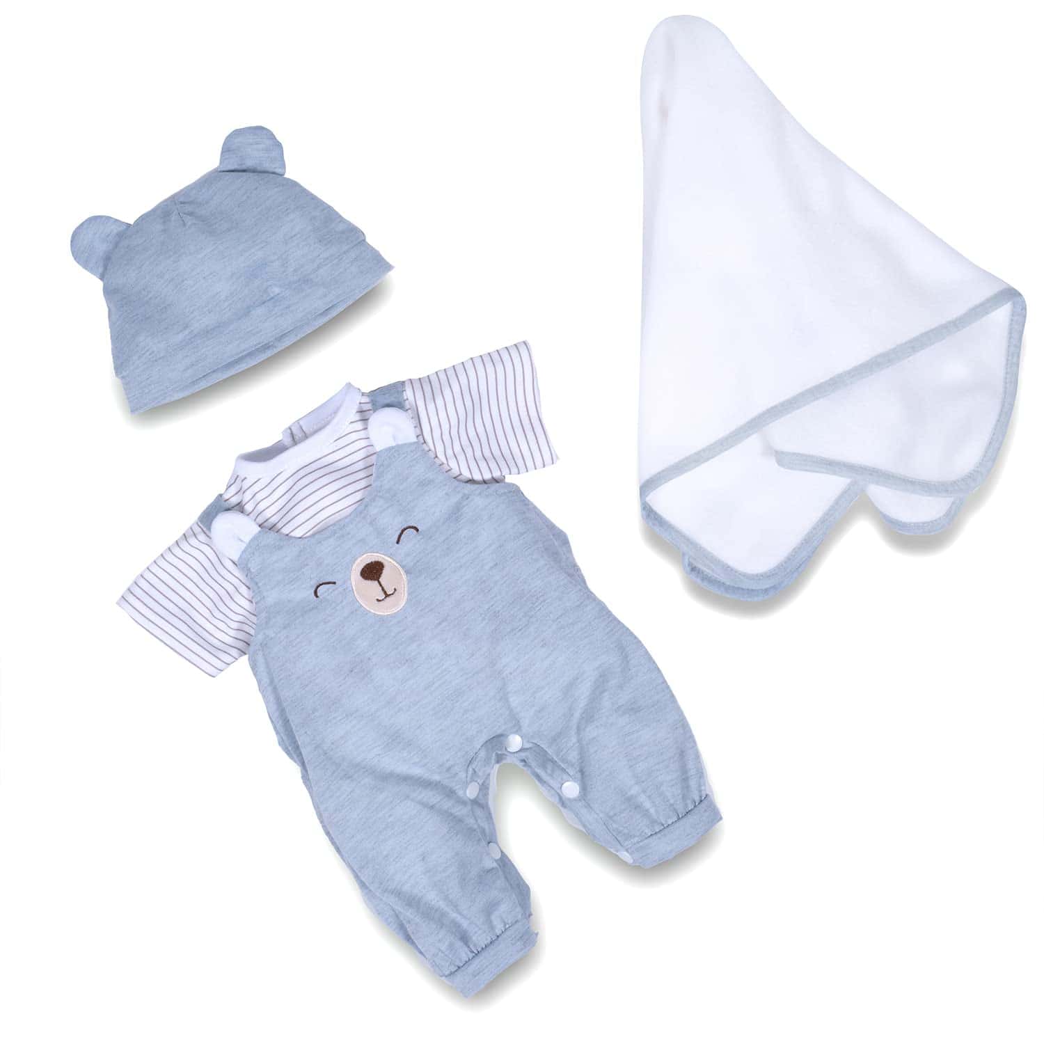 4. Viene con una camiseta a rayas marrón y blanca, un mono gris con una cara de oso bordada y orejas blancas, un gorro gris a juego con orejas 3D, y una manta de lana blanca.