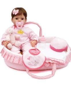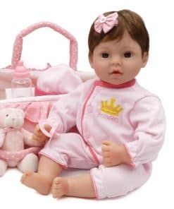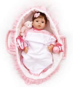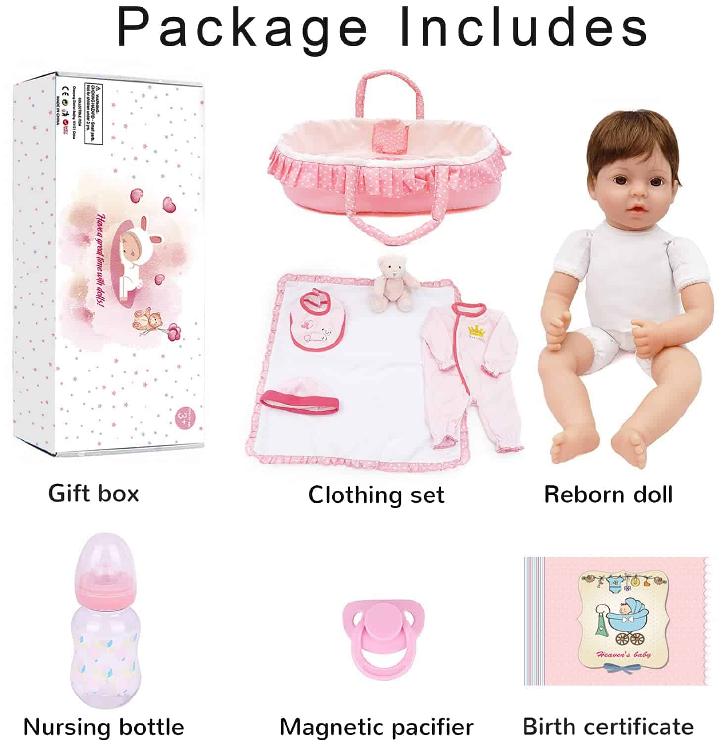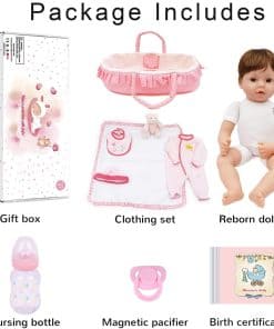 La muñeca Reborn mide 18 pulgadas de la cabeza a los pies, con cabeza de vinilo suave, extremidades de silicona 3/4 y un cuerpo de tela abrazable y ponderado, haciéndola aún más realista. Esta pequeña niña viene vestida con un adorable body rosa y un gorro a juego para mantenerla abrigada. Además de su atuendo, viene con un lazo rosa y un osito de peluche. La muñeca Reborn realista viene con un babero para bebés, botella de alimentación, manta, certificado de nacimiento, chupete magnético y cuna para bebés. Adopta un material amigable con el medio ambiente y no tóxico, cumple con los requisitos de seguridad de ASTM F963 y EN71 para niños mayores de 3 años.