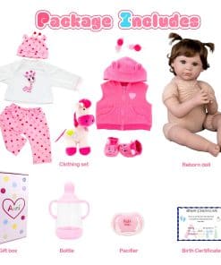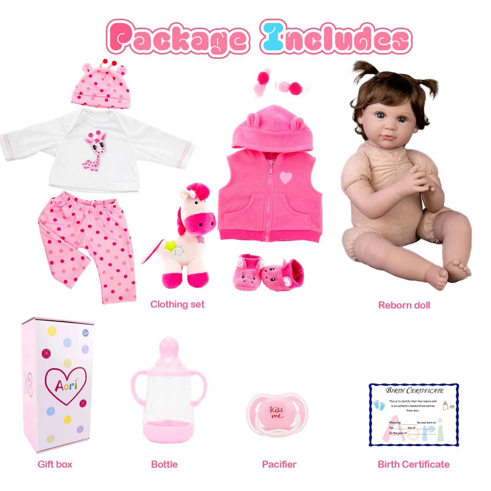 Aori es una nueva fuerza en la industria de juguetes, especializada en la producción de muñecas bebé reborn. Estamos dedicados a ofrecer a amantes y coleccionistas de todo el mundo las muñecas reborn más innovadoras y realistas. Nos enfocamos mucho en los detalles de las muñecas reborn: las expresiones faciales alegres, el cabello hecho a mano, la ropa bonita y bien ajustada, el vinilo de silicona más seguro, los dedos y dedos de los pies pintados a mano, y las costuras firmes. La muñeca Aori garantiza que tengas un servicio 100% satisfactorio. Nuestro objetivo es crear la muñeca perfecta para conservar la bondad y la belleza en los momentos de la vida. Especificaciones: Tamaño: 22 pulgadas de la cabeza a los pies Peso: 3.4 libras Material: cabeza de vinilo de silicona, extremidades de vinilo de silicona 3/4 con cuerpo relleno de algodón PP y cuentas de vidrio Cabello: cabello falso hecho a mano, se puede lavar pero se debe secar a baja temperatura Ojos: material acrílico, abiertos pero no pueden parpadear Caja que incluye: 1 Muñeca bebé renacida 1 Conjunto de trajes (igual que en la imagen) 1 Peluche de ciervo 1 Chupón magnético, 1 biberón, 1 babero, 1 mat 1 Certificado de nacimiento 1 Tarjeta de servicio