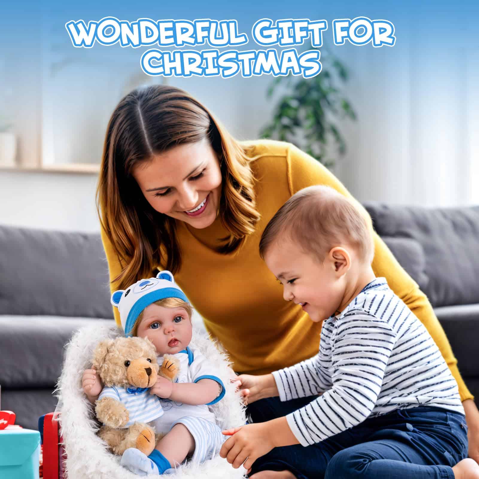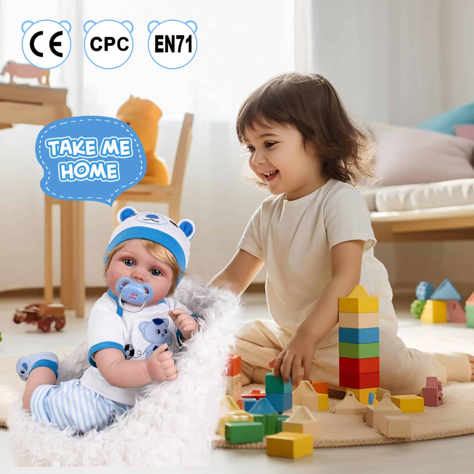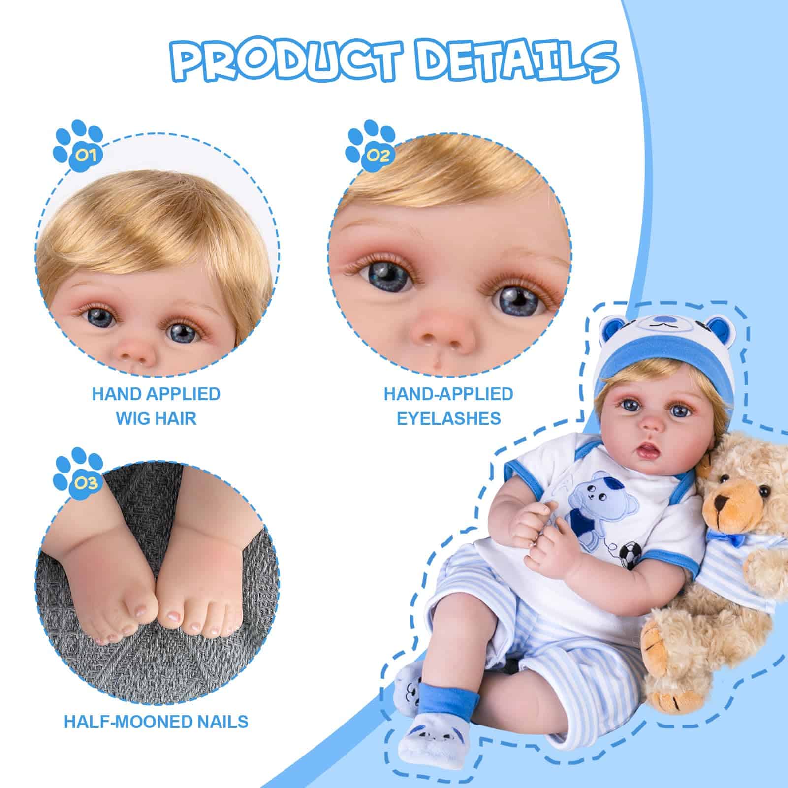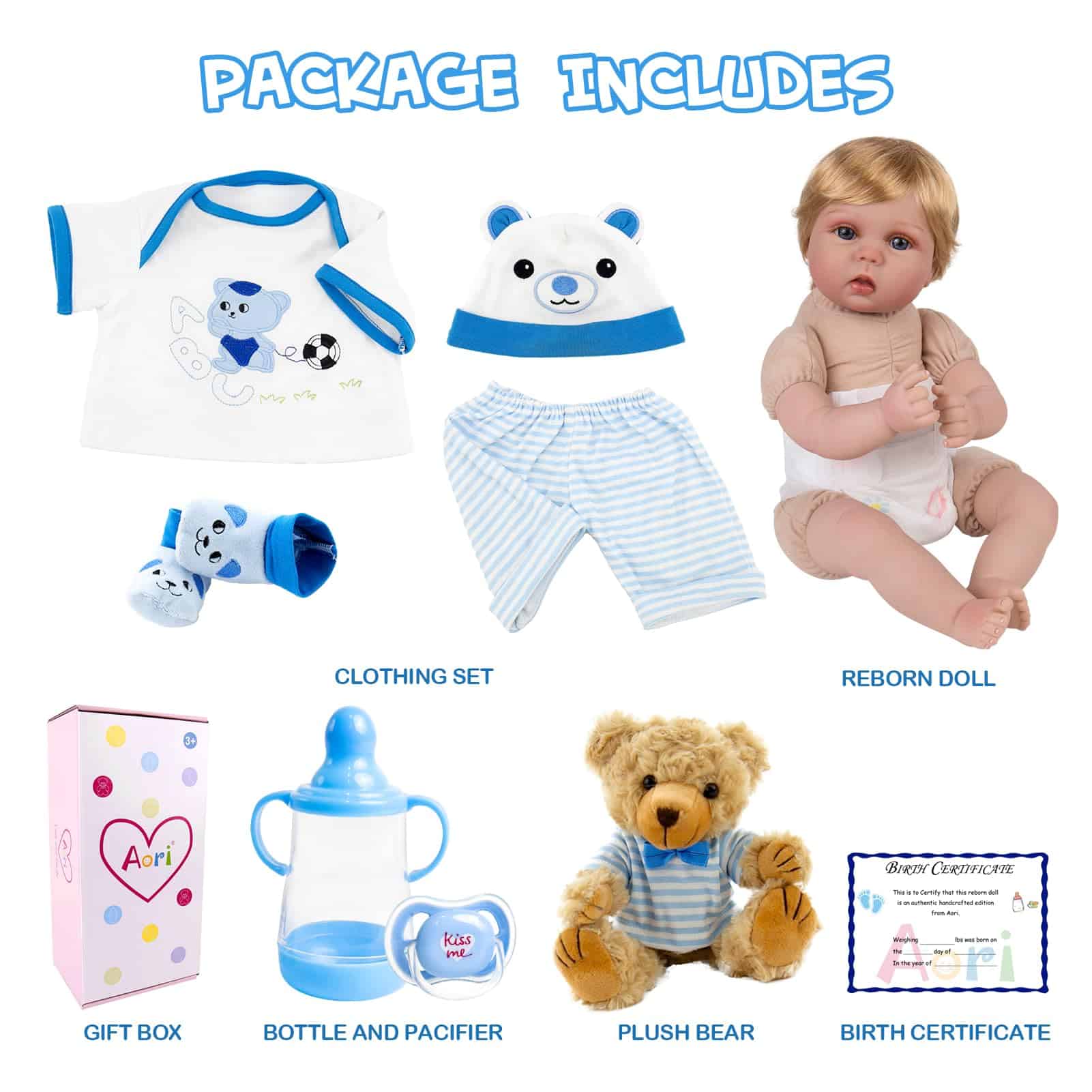 Aori es una nueva fuerza en la industria del juguete, especializada en la producción de muñecas bebé renacidas. Estamos dedicados a ofrecer a los amantes y coleccionistas de todo el mundo las muñecas bebé renacidas más innovadoras y realistas. Estamos muy enfocados en los detalles de las muñecas reborn: las expresiones faciales geniales, el cabello hecho a mano, la ropa bonita y bien ajustada, el vinilo de silicona más seguro, los dedos y dedos de los pies pintados a mano y la costura firme. La muñeca Aori garantiza que tenga un servicio 100% satisfactorio. Nuestro objetivo es crear la muñeca perfecta para conservar la bondad y la belleza en los momentos de la vida. Especificaciones: Tamaño: 22 pulgadas de la cabeza a los pies Peso: 3.4 libras Material: cabeza de vinilo de silicona, extremidades de vinilo de silicona 3/4 con cuerpo de algodón PP relleno y cuentas de vidrio Cabello: cabello falso hecho a mano. Se puede lavar, pero debe secarse a baja temperatura Ojos: material acrílico, abiertos pero no pueden parpadear Caja que incluye: 1 Muñeca bebé renacida 1 Conjunto de trajes (igual que en la imagen) 1 Peluche 1 Chupete magnético, 1 biberón 1 Certificado de nacimiento 1 Tarjeta de servicio