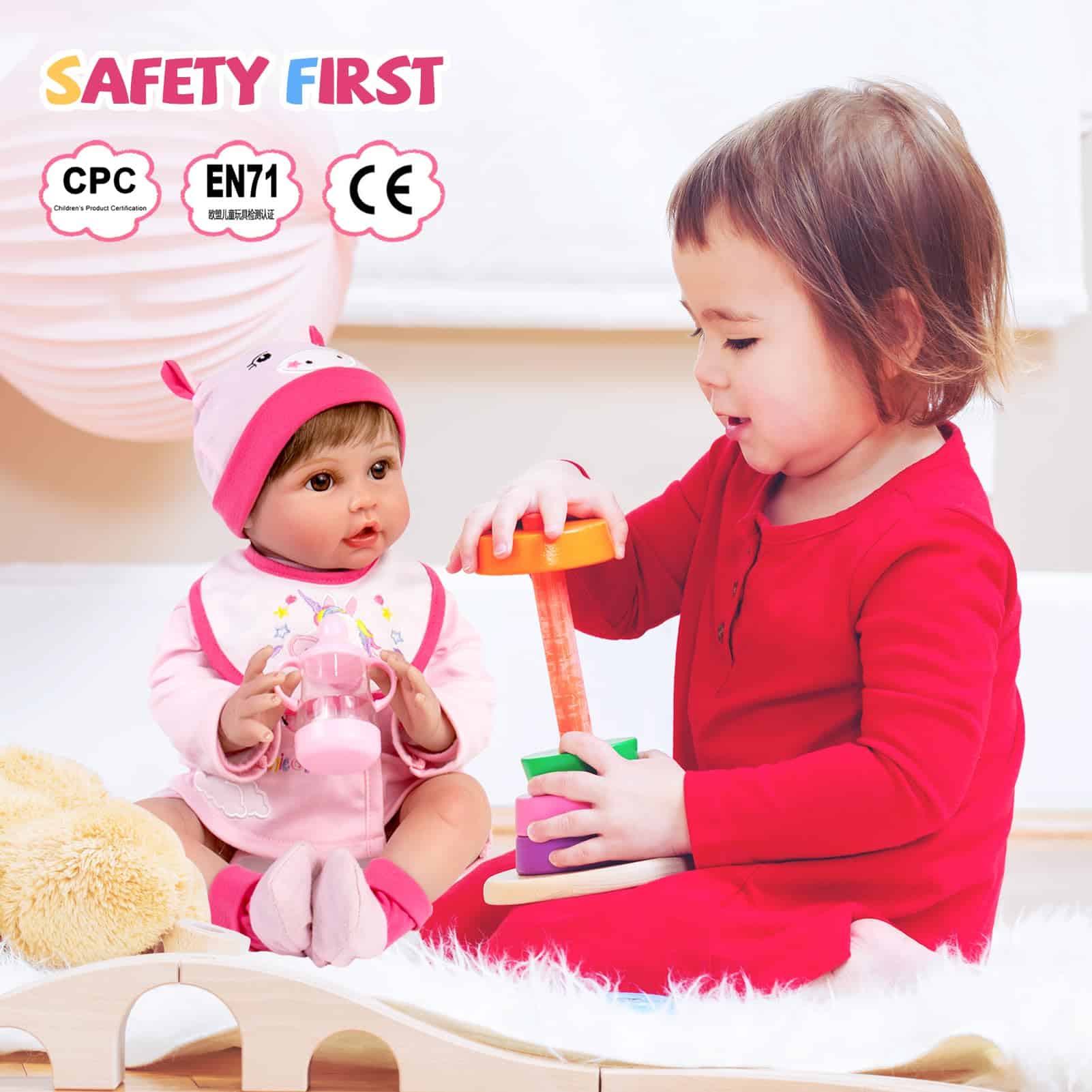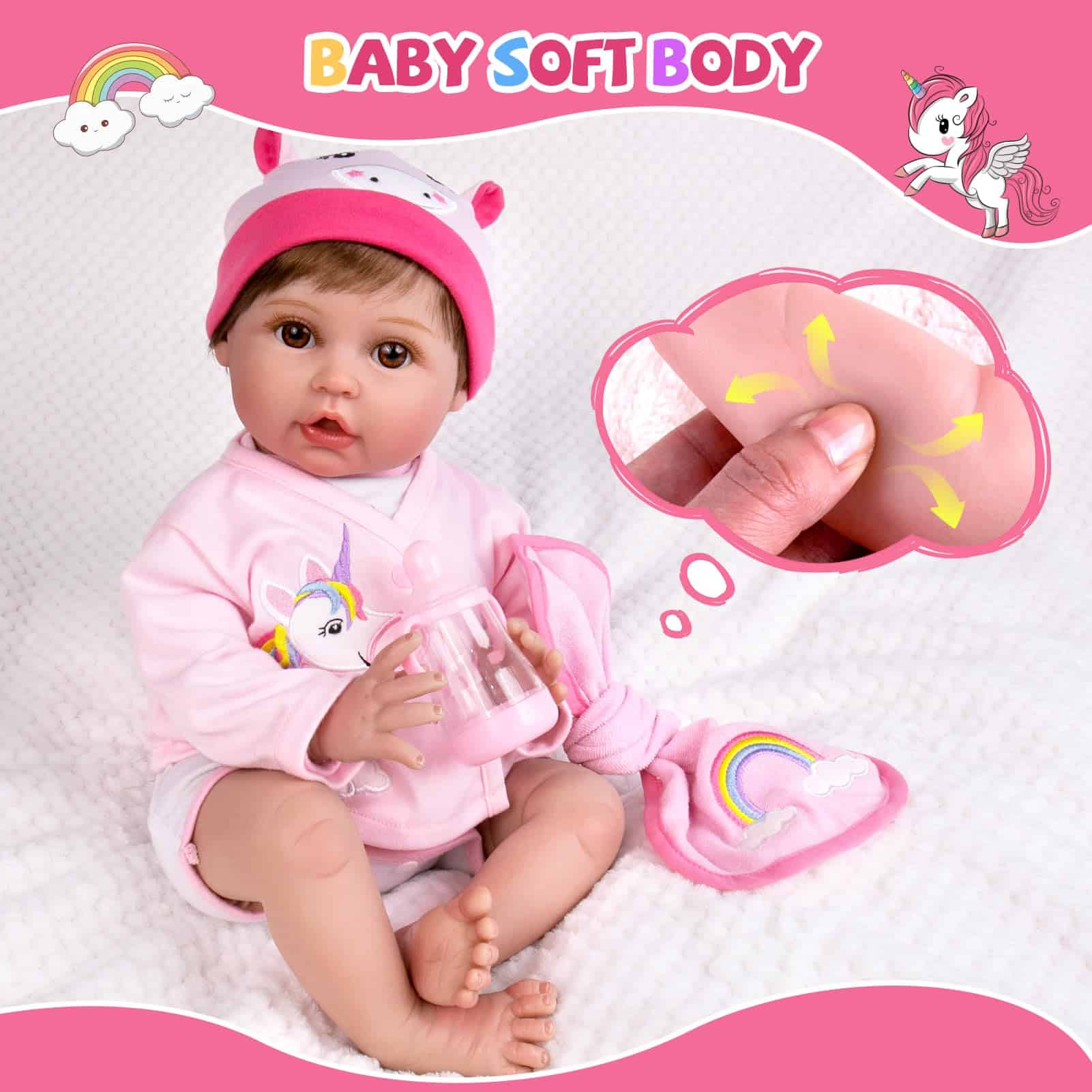 ¡Qué linda muñeca bebé con unicornio! ¡Está lista para aventuras al aire libre contigo en días soleados! Su rostro adorable, dulce sonrisa y grandes ojos marrones encantadores muestran que está muy feliz de conocerte. Nuestros detalles delicados hechos a mano hacen que la niña parezca una niña ingenua, esperando que la abraces. Especificaciones de la Niña Pequeña Linda: Tamaño: 22 pulgadas/55cm de la cabeza a los pies. Al igual que el tamaño de un bebé reborn real. Peso: 4.3 libras. Adecuado para que los niños lleven la muñeca bebé a todas partes fácilmente. Material: Cabeza de vinilo suave, extremidades de vinilo 3/4 con cuerpo de algodón PP y cuentas de vidrio. La bebé niña no es a prueba de agua. Cabello: Peluca de cabello de alta calidad hecha a mano. Fácil de cuidar. Ojos: Ojos marrones acrílicos realistas con pestañas aplicadas a mano.