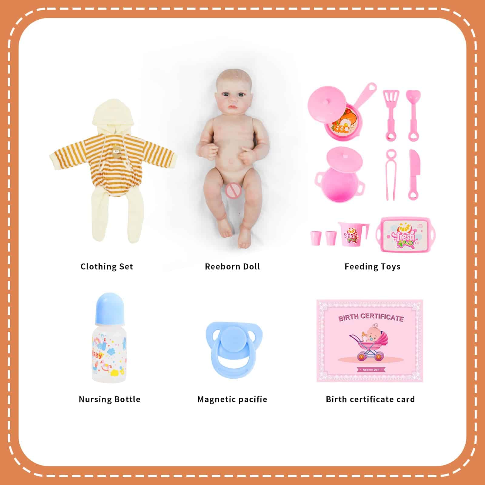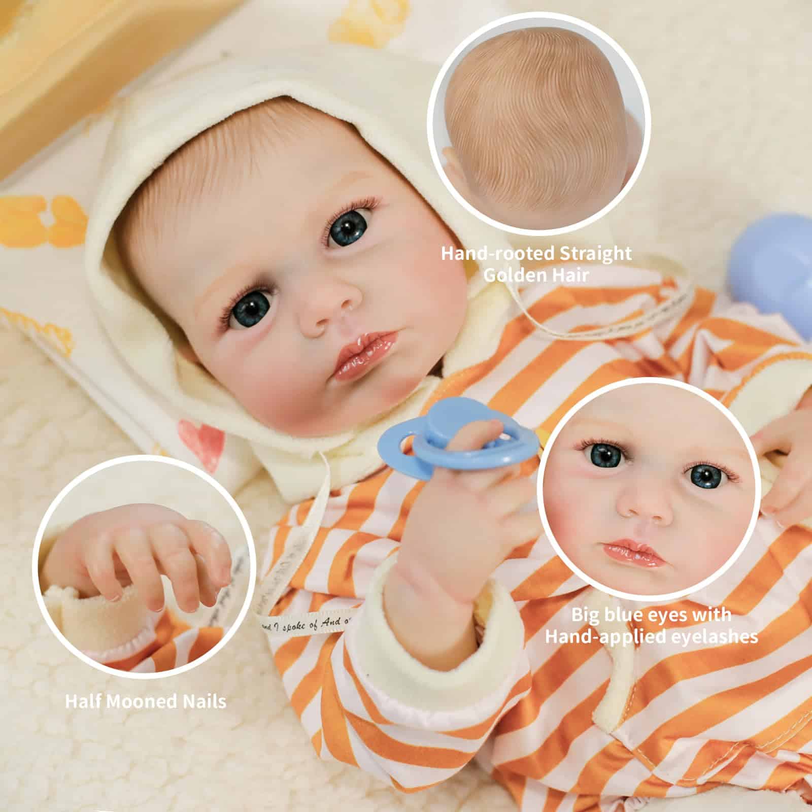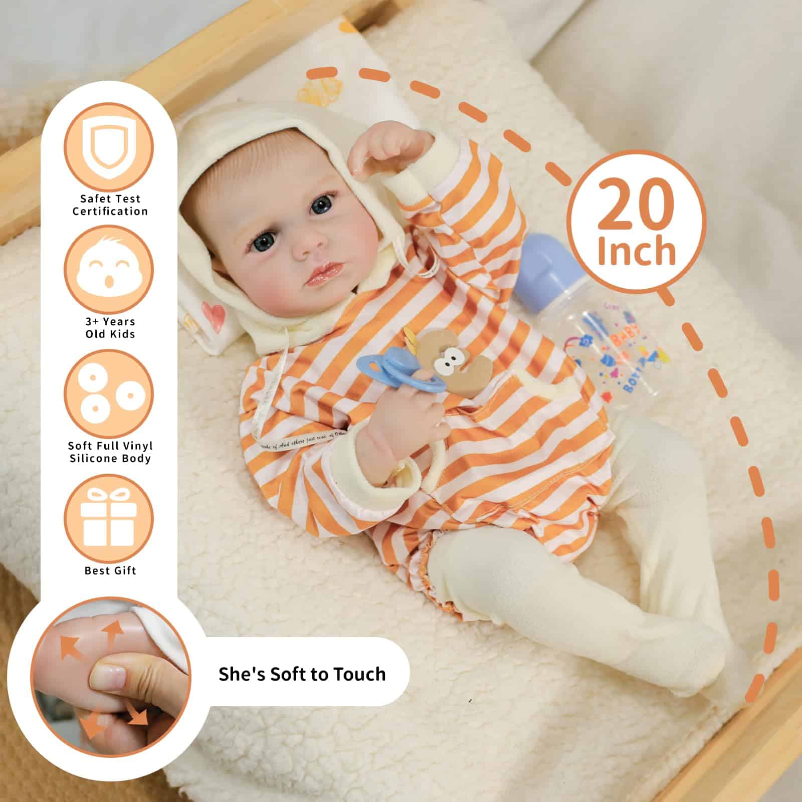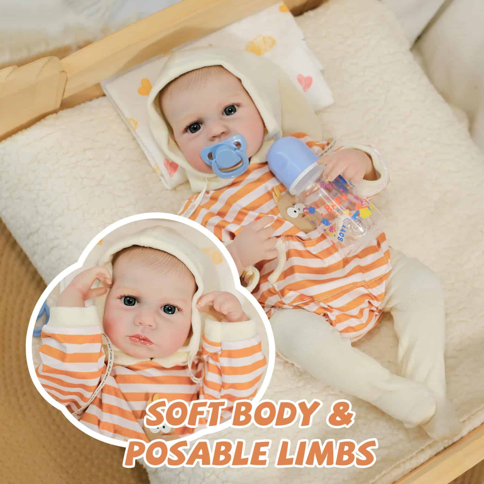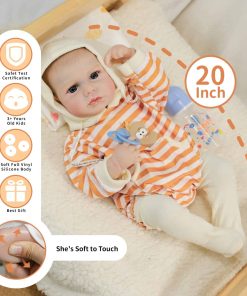 1. Nuestra muñeca de bebé reborn está fabricada en vinilo con una estructura única, tiene 20 pulgadas de altura, reflejando el tamaño real de un recién nacido. Perfectamente adaptada para ropa adorable de tamaño recién nacido, cochecitos, pañales y otros accesorios para bebés. 2. Nuestras muñecas de bebé realistas están vestidas con ropa especialmente diseñada, mostrando expresiones conmovedoras, rasgos faciales tiernos, miembros alargados, dedos y dedos del pie arrugados, y pestañas delicadas, haciéndolo parecer increíblemente realista. 3. Estas muñecas realistas de recién nacido miden 20 pulgadas de la cabeza a los pies, con un cuerpo suave perfecto para abrazar. Poseen una cara adorable, un tamaño ideal para niños y un diseño ligero, convirtiéndolo en un excelente compañero durante su crecimiento. 4. Todo el cuerpo de la muñeca reborn está fabricado en vinilo, cumpliendo con las normas de seguridad ASTM F963 y EN71, adecuado para niños a partir de 3 años. 5. Comparte momentos hermosos con esta muñeca de bebé reborn, creando recuerdos duraderos. Ya sea en el momento de dormir, jugar o simplemente exhibirla como una obra de arte, cada momento pasado con nuestra muñeca de bebé reborn está lleno de calidez y afecto. 6. La muñeca viene con una exquisita caja de regalo y un completo set de accesorios, perfecto para cuidar. Incluye: Muñeca reborn 1, Set de Ropa 1 (como en la foto), Chupete 1, Kit de Alimentación 1, Biberón de Juguete 1, Certificado de Nacimiento 1, Caja de Regalo 1. Una excelente opción para la compañía y colección de abuelos.