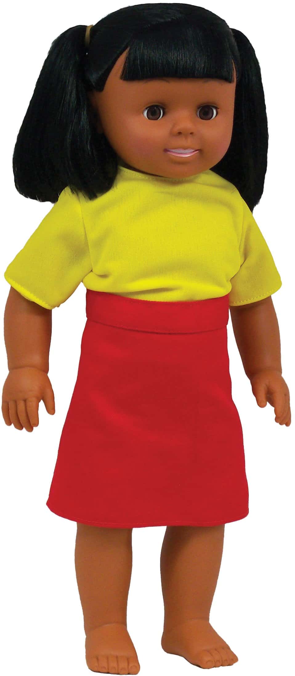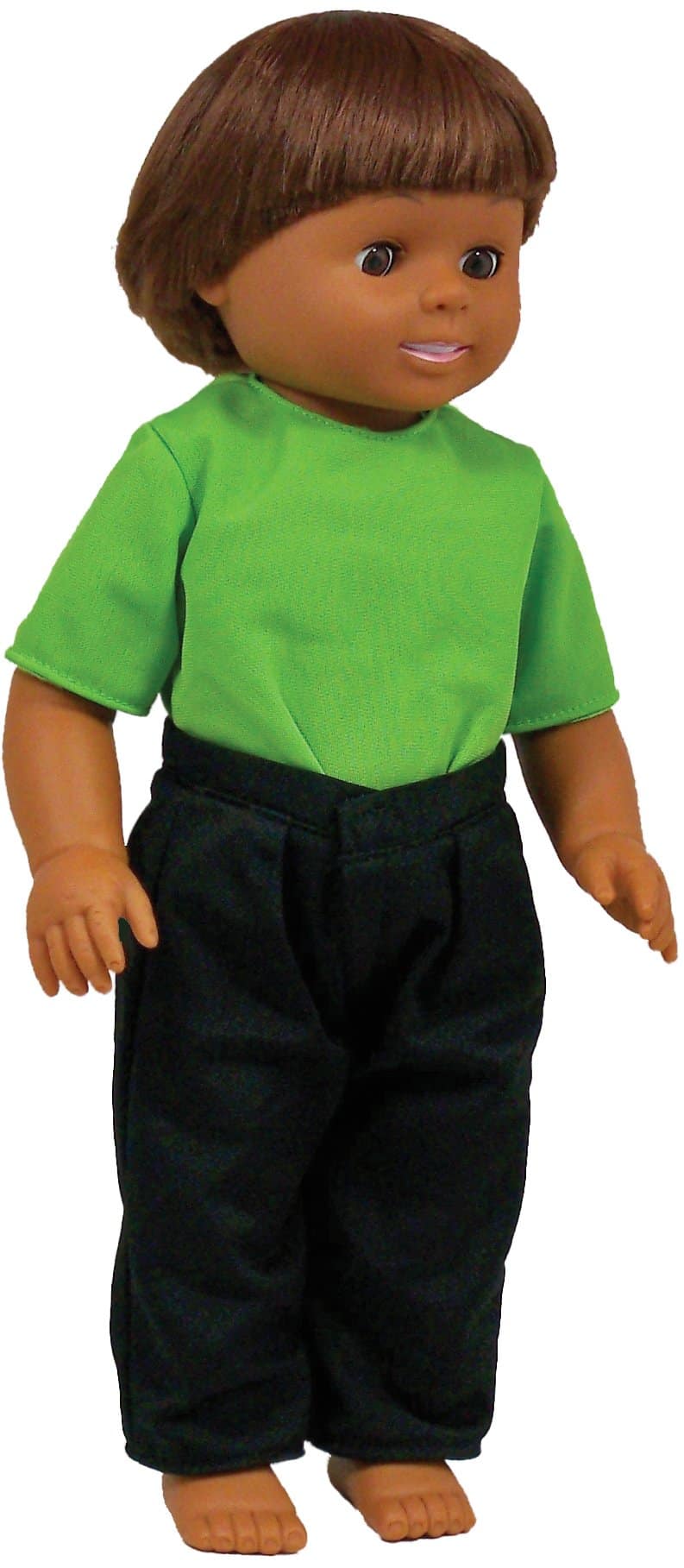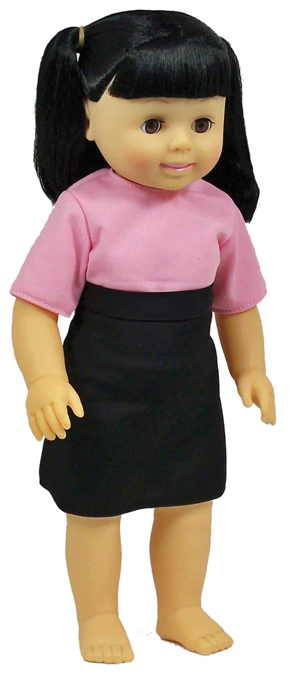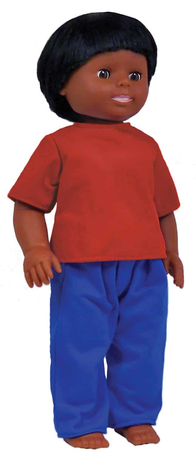 Muñecas de 16″ con cuerpo completo de vinilo con cabello natural tienen cabeza y extremidades articuladas y pueden mantenerse erguidas. Las muñecas vienen con ropa lavable a máquina para uso diario.