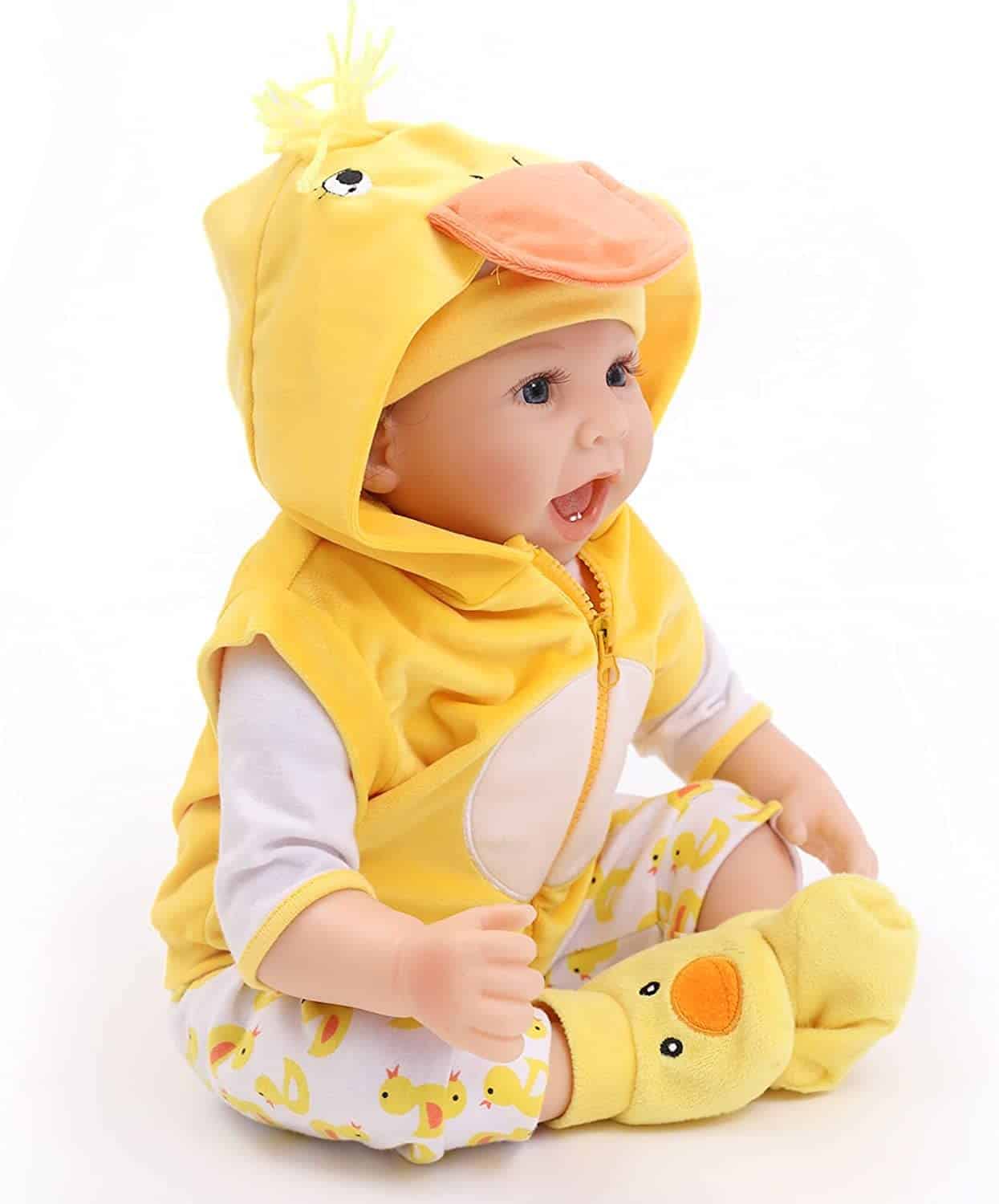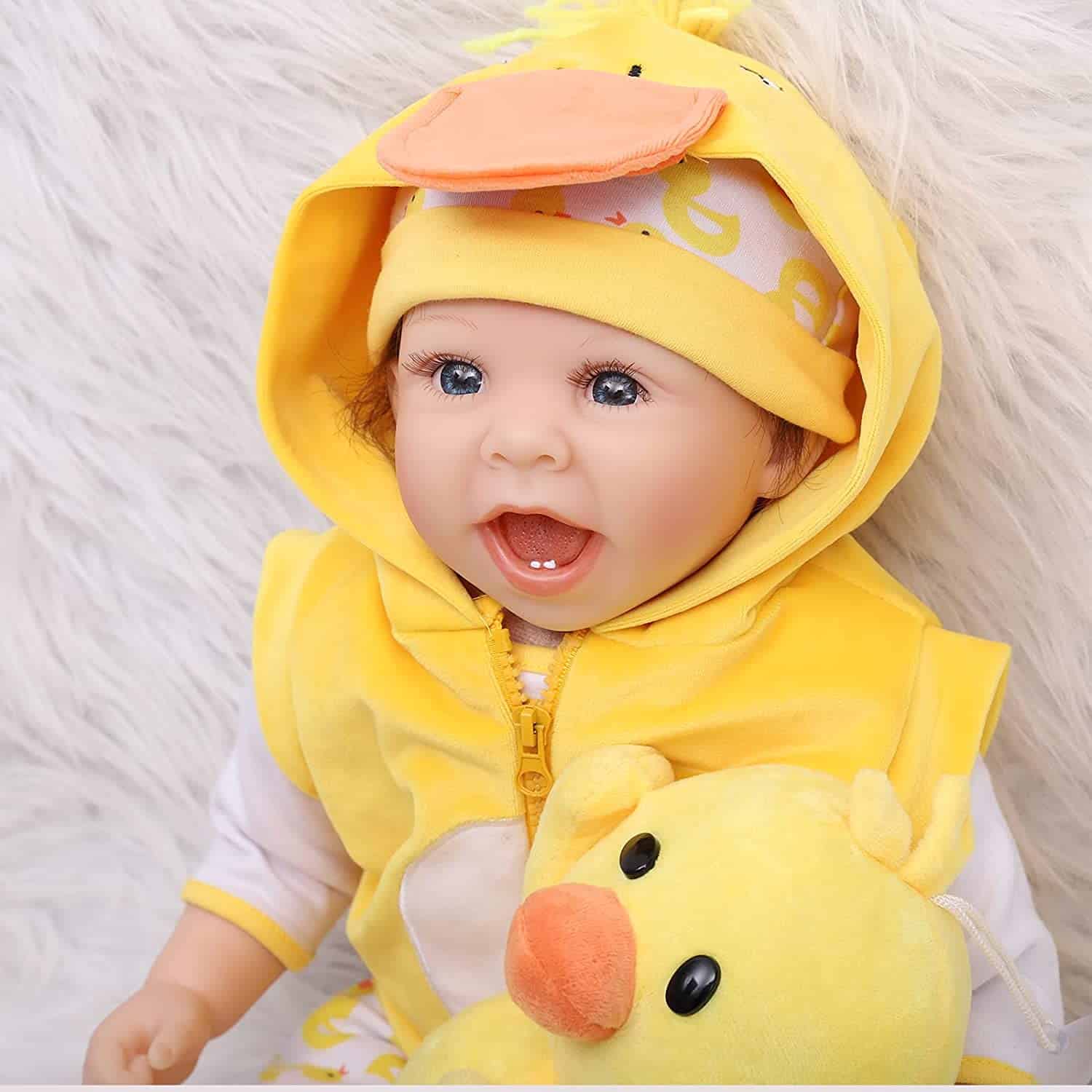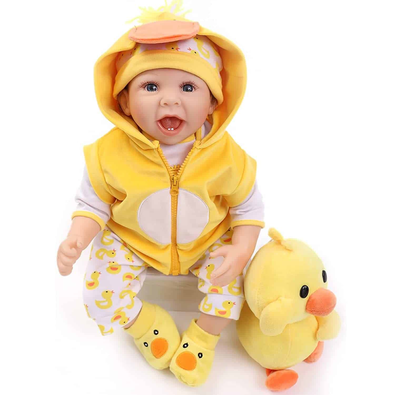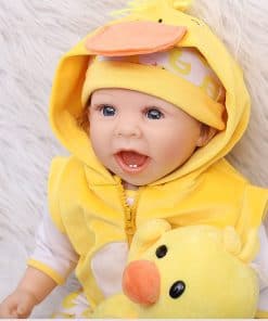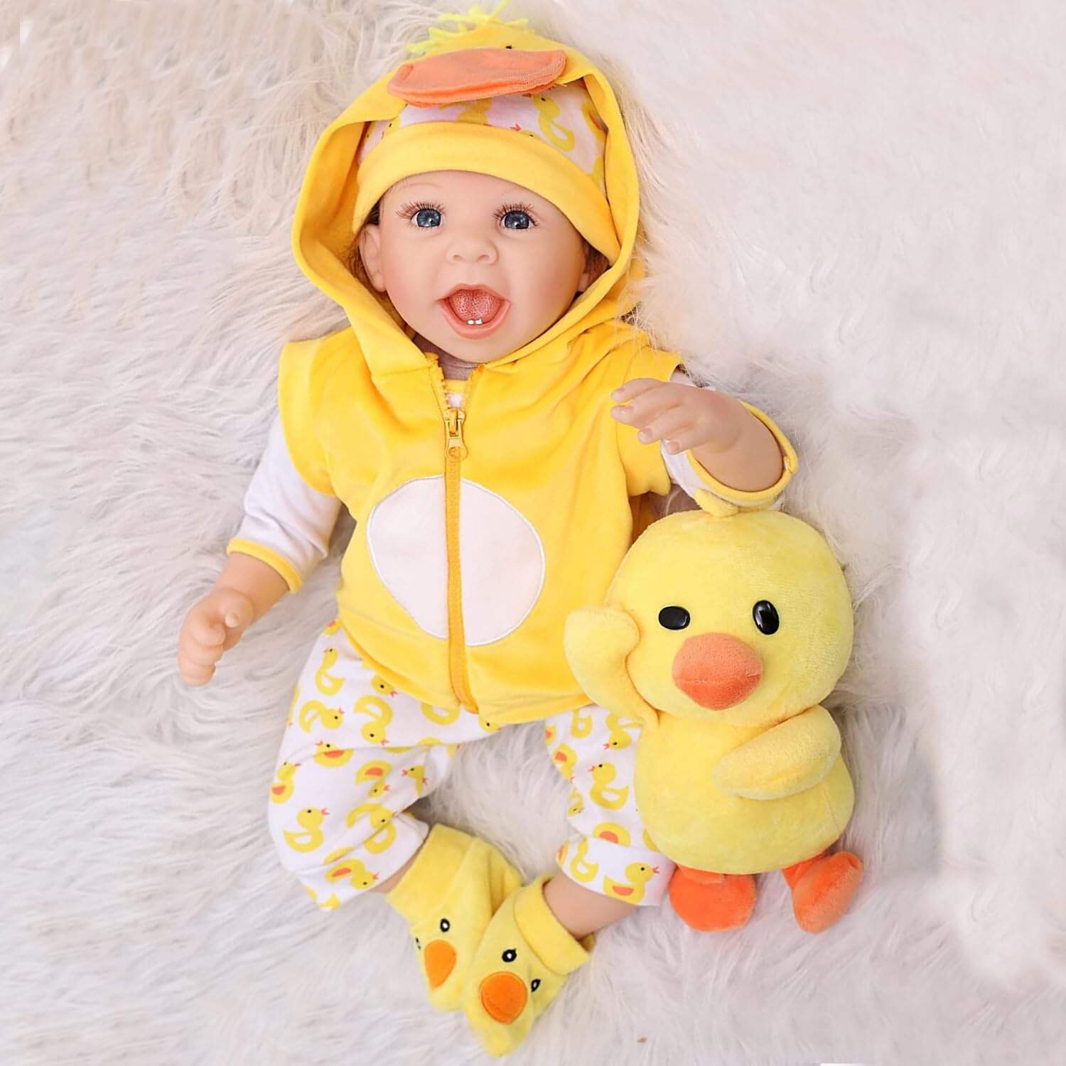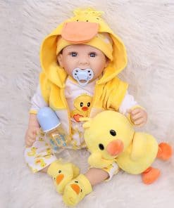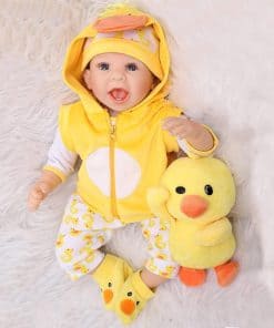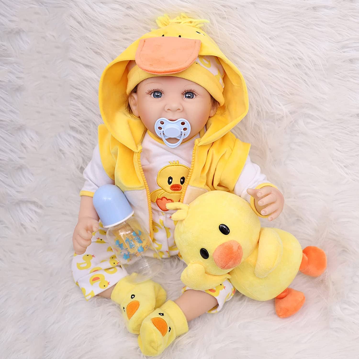 Muñeca de 22 pulgadas (tamaño de recién nacido) que viene con ropa como se muestra en la imagen. Peso de 1.2 kg con cabeza y extremidades de silicona suave y cuerpo de tela gruesa para una sensación de muñeca real. Los brazos y piernas se pueden mover arriba y abajo y la muñeca puede sentarse y acostarse, aunque no puede llorar, reír o comer. El paquete incluye la muñeca, un biberón, un chupete, un patito amarillo, un certificado de nacimiento, ropa y una caja de regalo exquisita. Cumple con los requisitos de seguridad de ASTM F963 y EN71, lo que la convierte en un regalo ideal para días festivos, cumpleaños o como compañera de abuelos y abuelas.