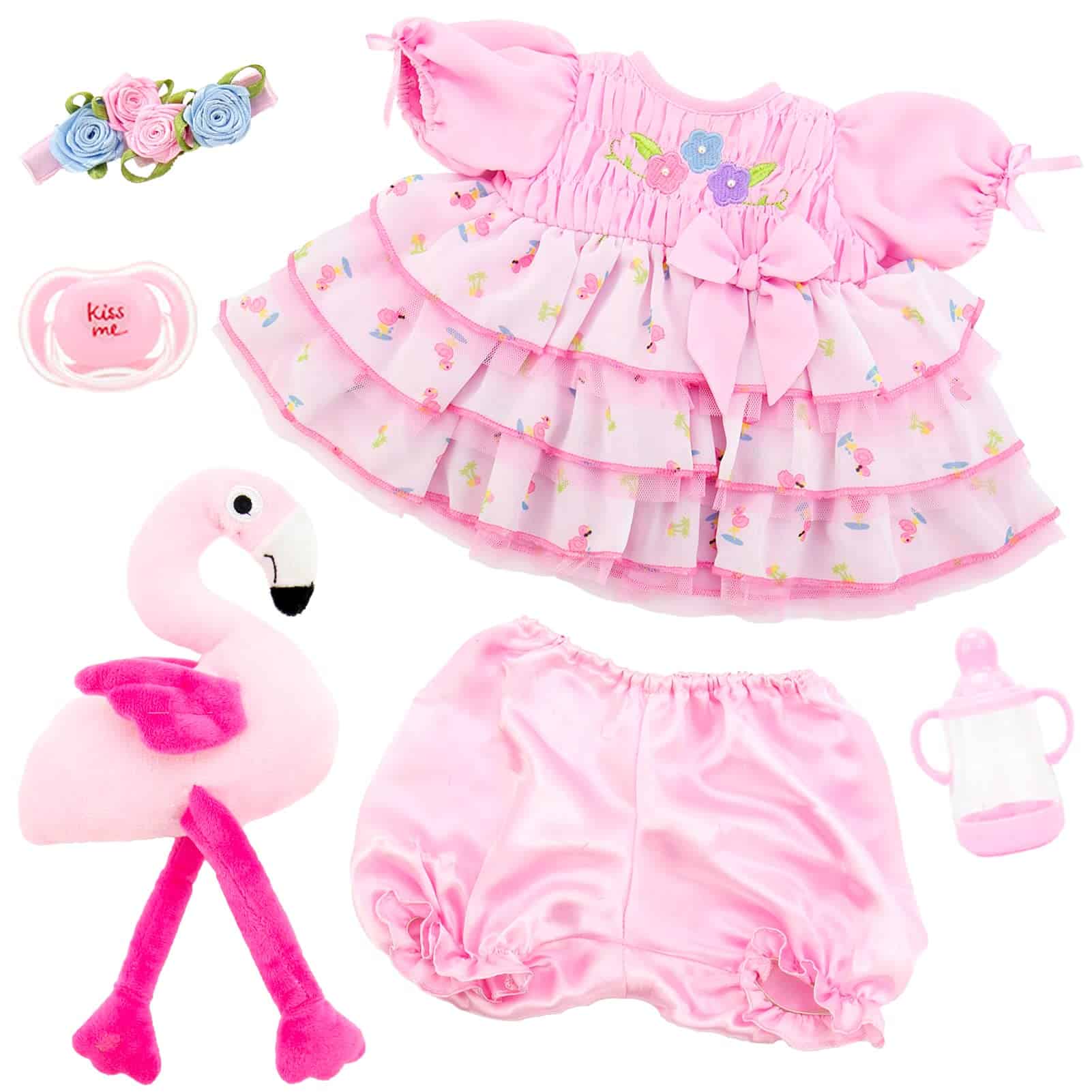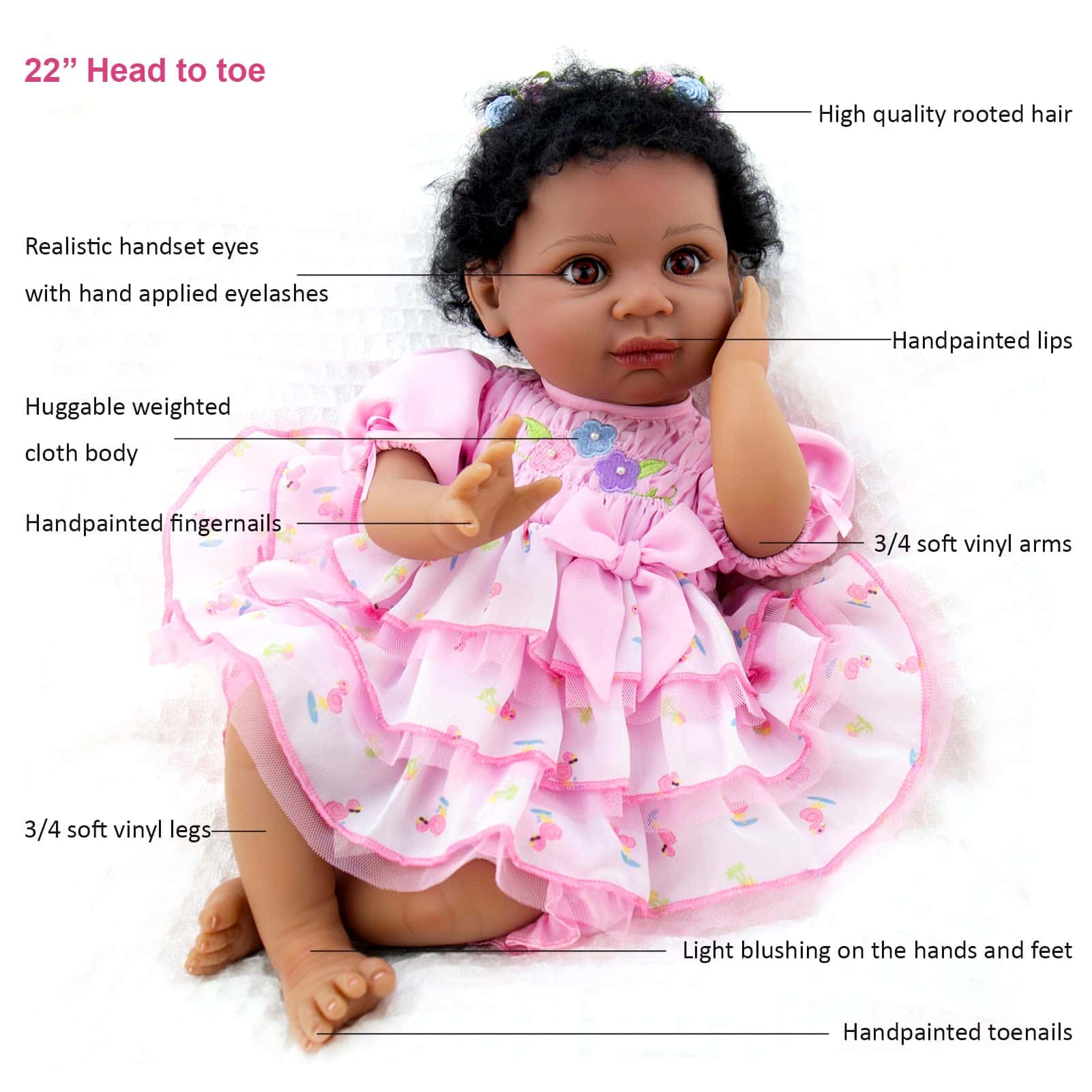 «Aori es una nueva fuerza en la industria del juguete, especializada en la producción de muñecas reborn. Nos dedicamos a ofrecer a amantes y coleccionistas de todo el mundo las muñecas reborn más innovadoras y realistas. Nos centramos en los detalles de las muñecas reborn: las geniales expresiones faciales, el cabello hecho a mano, la ropa hermosa y bien ajustada, el vinilo suave más seguro, dedos y dedos de los pies pintados a mano y costuras firmes. La muñeca Aori garantiza que tengas un servicio 100% satisfactorio. Nuestro objetivo es crear la muñeca perfecta para conservar la bondad y la belleza en los momentos de la vida. Especificaciones: Tamaño: 22 pulgadas de la cabeza a los pies. Peso: 3.4 libras. Material: cabeza de vinilo suave, extremidades de vinilo suave 3/4 con cuerpo de algodón PP relleno y cuentas de cristal. Cabello: cabello negro enraizado a mano. Puede ser lavado, pero necesita secarlo a baja temperatura. Ojos: material acrílico, abiertos pero no pueden parpadear. Caja incluida: 1 Muñeca de bebé reborn 1 Conjunto de disfraces (como en la imagen) 1 Juguete de flamenco de peluche 1 Bolsa de flamenco 1 Chupete magnético, 1 botella 1 Certificado de nacimiento 1 Tarjeta de servicio»