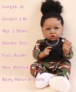 Tamaño – Aproximadamente 22.8″/58cm de cabeza a pies. Peso – Aproximadamente 3.1 libras. Material – Vinilo de silicona de alta calidad. La cabeza, brazos y piernas de la muñeca están construidos expertamente en vinilo de silicona, los hombros y el cuerpo son de tela con relleno interno. Te sentirás muy bien al tocar la muñeca. Los miembros son móviles, la muñeca puede sentarse fácilmente y acostarse, pero NO puede estar de pie ni hablar. Cabeza – La cabeza simula el tamaño de un bebé real, muy linda. Pestañas aplicadas a mano. Cabello – peluca de cabello de alta calidad. Puede adquirir cualquier forma y fijarse. Como el cabello de un bebé real, se puede lavar. Ojos – La muñeca tiene ojos grandes y encantadores hechos de acrílico de alta calidad, parecen los ojos reales de un bebé, claros y brillantes, extremadamente realistas. Pero los ojos no pueden parpadear ni cerrarse. Los párpados de doblez muy hermosos, como si los ojos del bebé parpadearan. Las fosas nasales están abiertas, como si la muñeca estuviera respirando. La piel es el lugar más único de esta muñeca, los diseñadores dedicarán mucho tiempo a que la piel del bebé parezca más realista con procesos de fabricación multicapa. El color después del tratamiento especial, por lo que no se desvanecerá. Esta muñeca es 100% artesanía hecha a mano con pintura a mano.