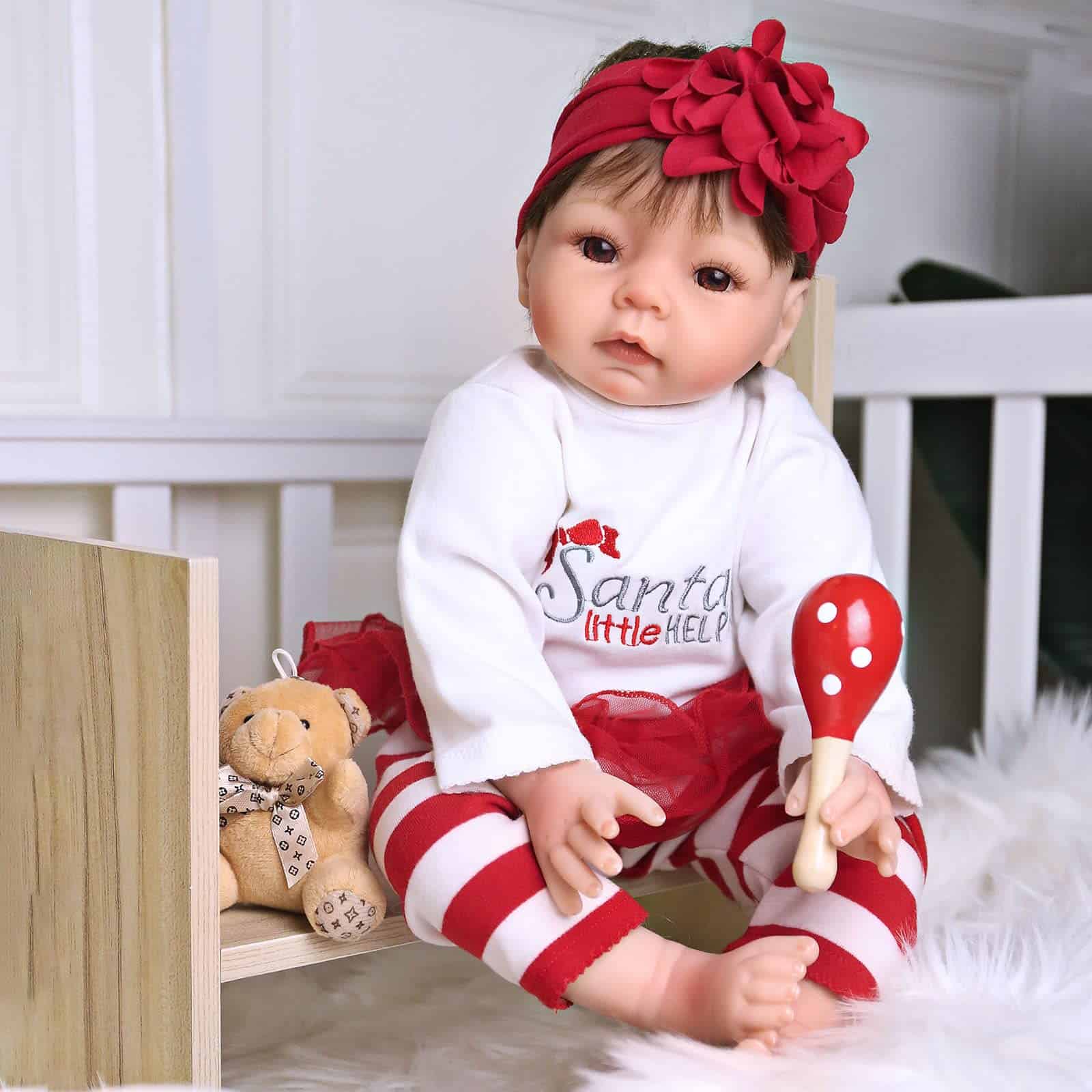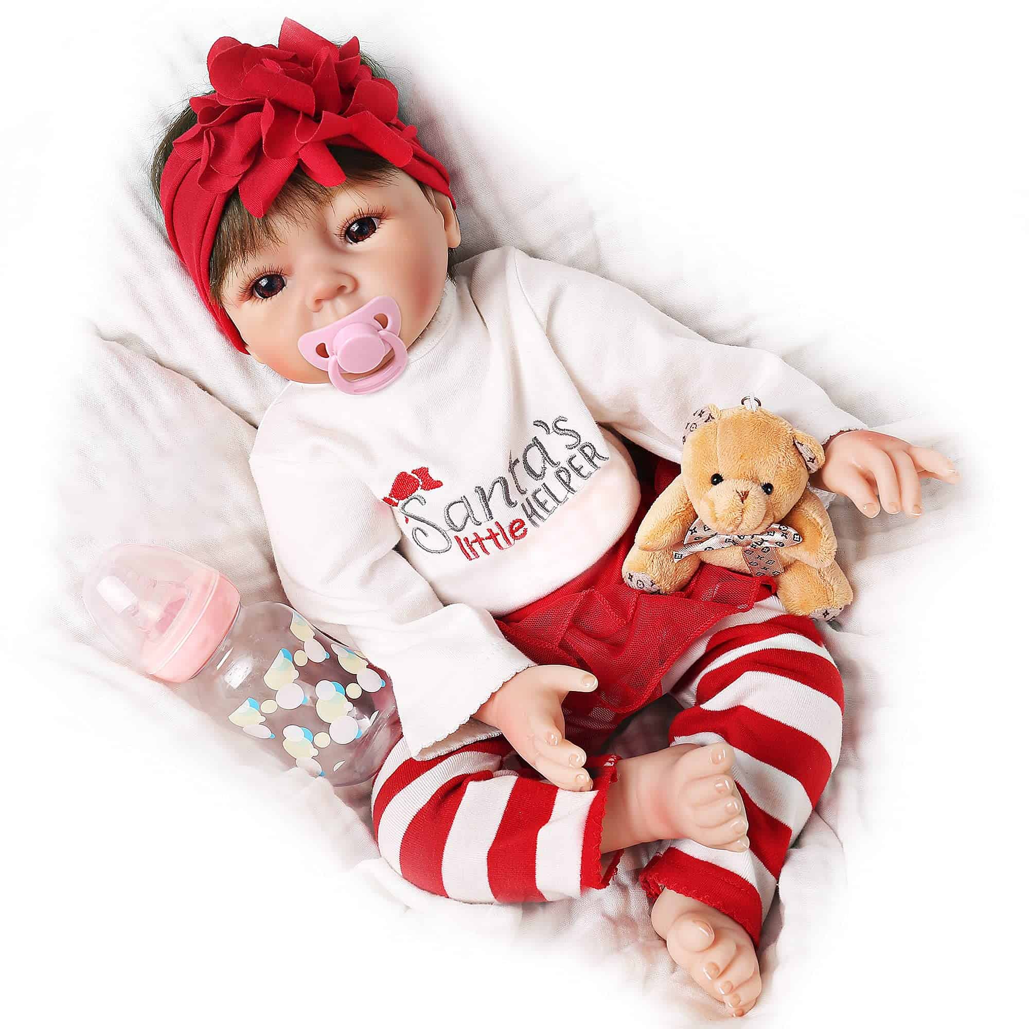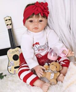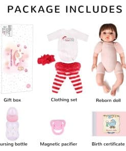 MATERIALES: Las muñecas del bebé recién nacido tienen cuerpo de vinilo suave y suave, materiales seguros no tóxicos y puros respetuosos con el medio ambiente. REGALO: Las muñecas realistas de bebés recién nacidos pueden ser consideradas tanto como un regalo para su hijo como un regalo de colección. SEGURIDAD: Las suaves muñecas reborn de silicona realistas cumplen con los requisitos de seguridad y son seguras para su hijo. CARACTERÍSTICAS FLEXIBLES: Las muñecas pueden sentarse y acostarse con manos y pies flexibles con uñas. MUÑECA REBORN REALISTA: Las muñecas recién nacidas tienen una cara adorable y encantadora, con detalles pintados delicados de dedos y cejas. También tienen un cuerpo de tela ponderado para sentirse como un bebé real. Detalles: Tipo de artículo: Muñecas Género: Unisex Dimensiones: 22 pulgadas de pies a cabeza Peso: 3 LB Material: Vinilo Rango de edad: 3 Seguridad: EN71 (Suave de seguridad) Normas UE Flexibilidad: las extremidades son flexibles para moverse Cabello: Hecho a mano Ojos: Marrones Paquete incluido – 1 Muñeca Bebé Reborn 1 Un conjunto de ropa como se muestra 1 Chupete magnético 1 Biberón 1 Juguete oso 1 Certificado de nacimiento 1 Caja de regalo Acerca de Nosotros: Estamos especializados en la producción de muñecas reborn de bebé durante tantos años y estamos dedicados a ofrecer a los amantes y coleccionistas de todo el mundo las muñecas reborn más innovadoras y realistas. El Sentido Real: Nuestra pasión es crear muñecas que acompañen a los niños, calienten su corazón y sanen el alma. Lo más importante es que esperamos que la muñeca reborn ofrezca una oportunidad para ayudar a tu hijo a ejercitar su habilidad de práctica. Suministro Hecho a Mano: Esta muñeca niña de silicona tiene un cabello castaño con una diadema encantadora, detalles hechos a mano como sonrojos, pliegues detallados, dedos y uñas de las manos y pies, labios, pestañas, cejas barnizadas mate. Cada detalle es importante para nosotros: las expresiones faciales entrañables, telas adorables y únicas, el mejor porcelana o vinilo y costura experta y puntadas.