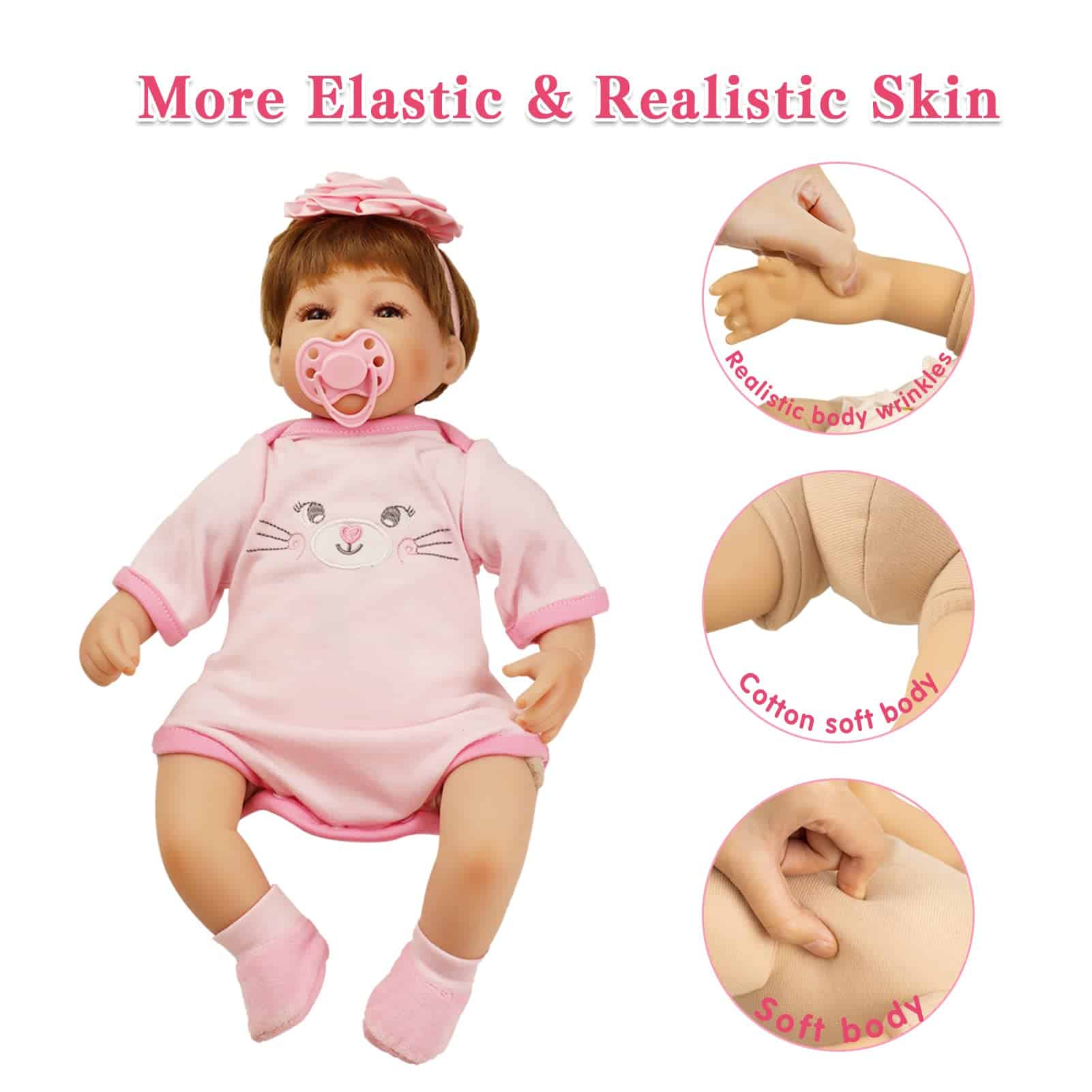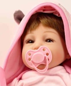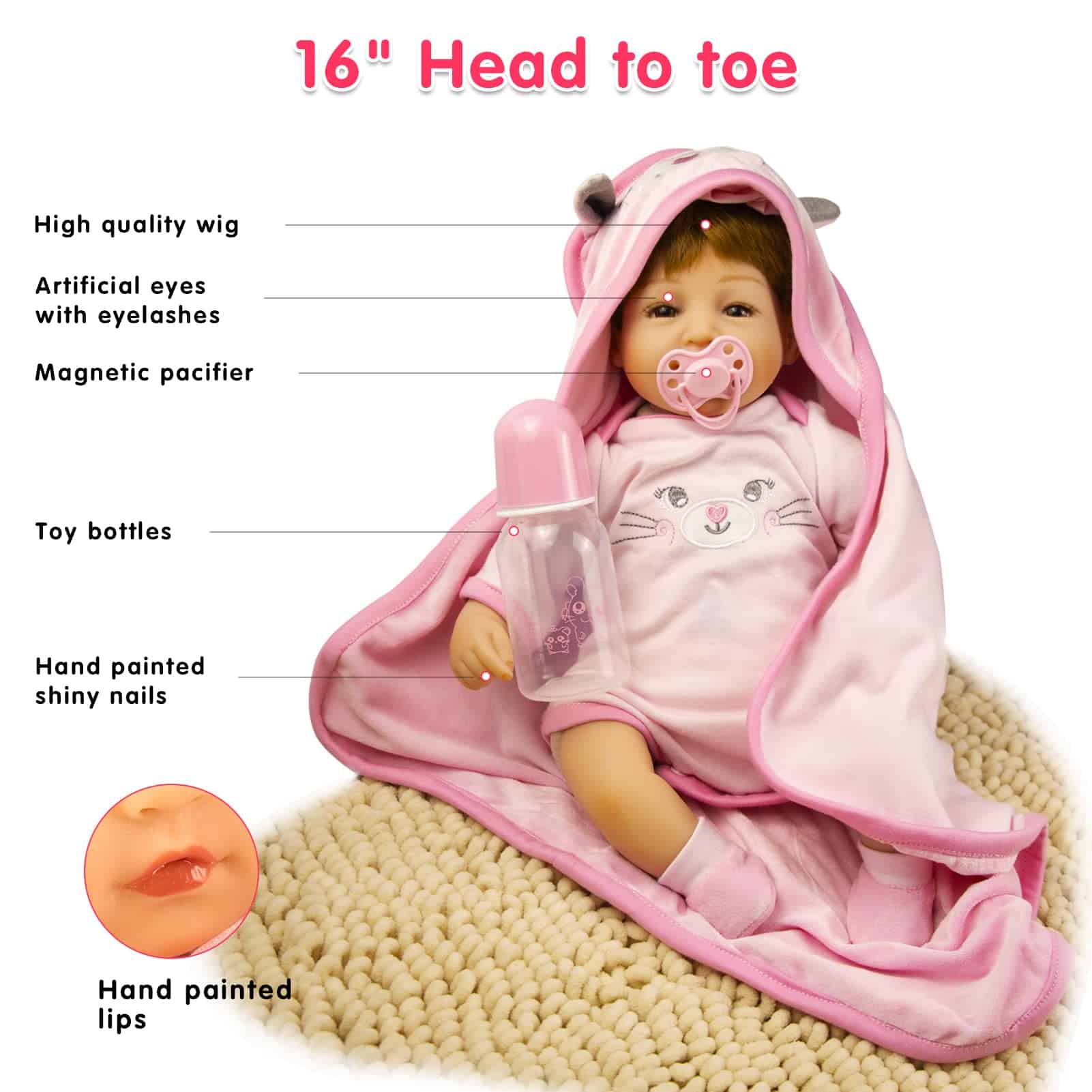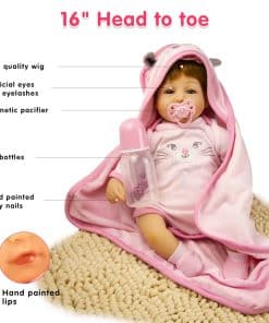 Muñeca Reborn de Vinilo de Silicona de Niña de 16 pulgadas, con cabello artificial, ojos realistas y detalles pintados a mano. Cuerpo de vinilo de alta calidad y cuerpo ponderado para mayor realismo. Incluye muñeca, biberón, chupón magnético, diadema rosa, pañal, tarjeta de nacimiento, caja de regalo y set de ropa como se muestra en la imagen. Perfecta compañía para niños y adultos. Nota: El cabello es implantado a mano, los ojos no se cierran, y la muñeca puede presentar un ligero olor al ser nueva.