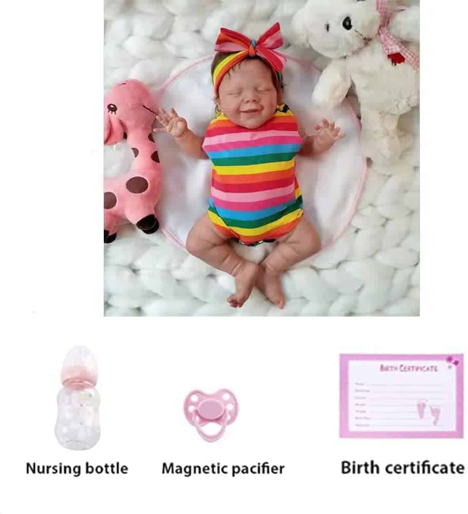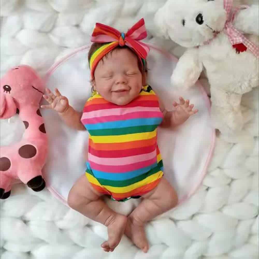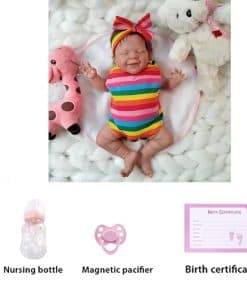 Acerca de esta muñeca Reborn Bruny mide 18 pulgadas de la cabeza a los pies, pesa aproximadamente 2.45 libras. La cabeza y las extremidades están hechas de vinilo suave silicona. Es una niña durmiendo. Tiene una cara adorable con cejas pintadas a mano y pestañas pegadas a mano. La muñeca realista de bebé recién nacido está articulada como una muñeca de bebé. La bebé realista es anatómicamente correcta. Tiene cabello castaño de aspecto real, que está hecho de mohair premium. Viene con ropa y una caja de regalo.