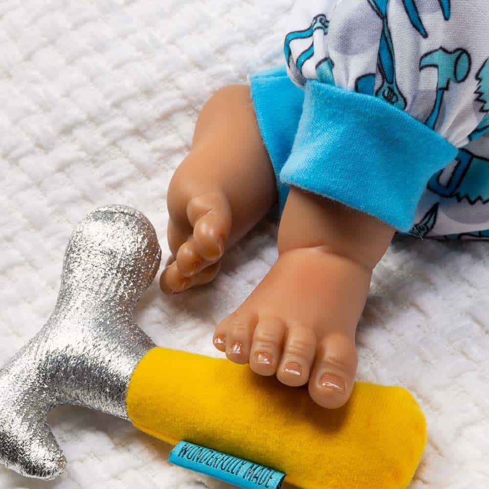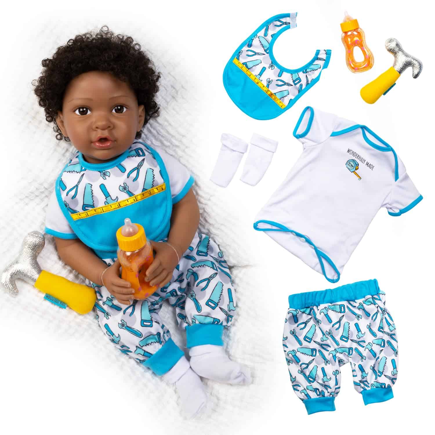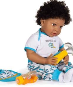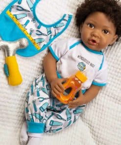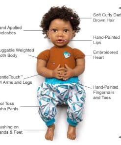 Disfruta de un abrazo cálido y realista con este muñeco bebé africano americano. Creado con amor y cuidado por la reconocida artista americana Karen Scott, este muñeco está hecho de vinilo GentleTouch premium para una sensación suave y realista. Viene en una caja de regalo para coleccionistas e incluye un body suave, babero, pantalones estampados, cinta métrica y martillo de peluche. Cumple con los estándares de seguridad más rigurosos para ser un recuerdo confiable y seguro para coleccionar.