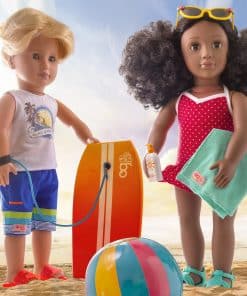 Destacados: – Muñeco surfero regular no-posable de 18 pulgadas – Cabello rubio dorado ondulado y ojos verdes brillantes – incluye muñeco, traje de verano y tabla de surf – Compatible con la mayoría de muñecos de 18 pulgadas incluyendo American Girl – recomendado para niños a partir de 3 años (piezas pequeñas) – no requiere pilas. ¡Haz surf y atrapa algunas olas con el muñeco regular de Nuestra Generación – Gabe, el muñeco surfero de 18 pulgadas! Gabe es un muñeco no-posable con ojos verdes brillantes y cabello dorado rubio ondulado y casual que es super divertido de peinar. Lleva un conjunto de verano relajado con una camiseta con estampado de «estilo de surf», shorts a rayas azules y cómodas chanclas naranjas brillantes, ¡y viene con su propia tabla de surf naranja! A Gabe le encanta explorar la playa y pasar el rato en la costa. ¡Lleva a Gabe en aventuras playeras con su amiga Coral y el vehículo My Way and Highways 4×4! Ten en cuenta: ¡a Gabe le encanta la playa simulada, pero el agua y el sol reales pueden dañarlo! (Muñecos y 4×4 se venden por separado. Compatible con muñecas American Girl).