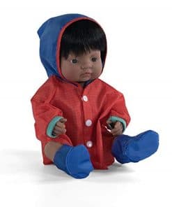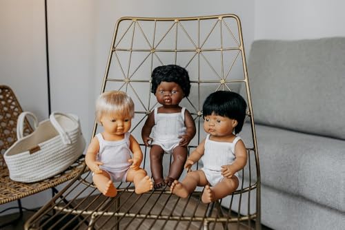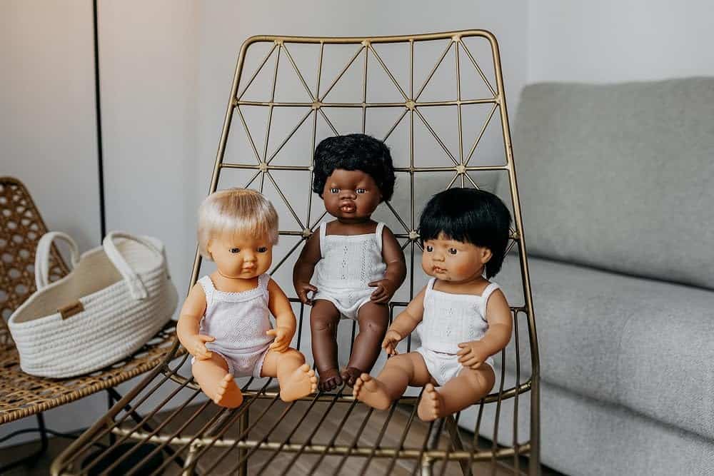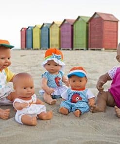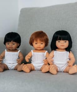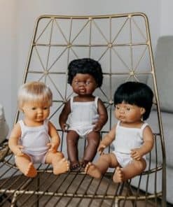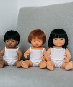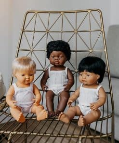 Muñecos vestidos con ropa interior y presentados en una caja. Hechos de vinilo suave, extremadamente resistente y flexible. Cabeza, brazos y piernas articulados. Cuerpo hermético y perfumado. Pelo cosido. Rasgos faciales muy definidos que ayudan a los niños a diferenciar entre razas. Ayudan a los niños a entender conceptos como familia, diversidad, convivencia.