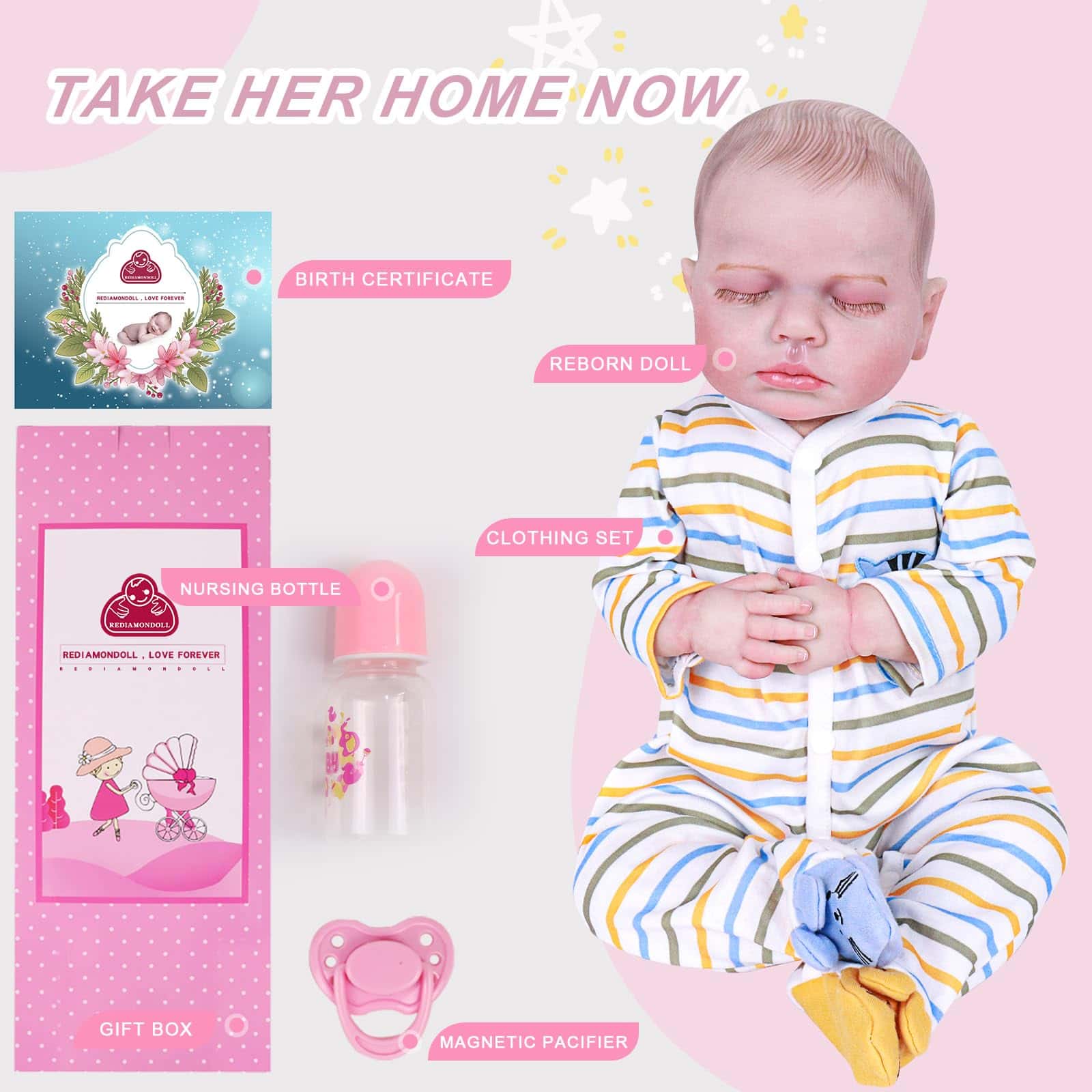 5. COMPLETO CON ACCESORIOS: Este muñeco de bebé reborn viene completo con un set de accesorios, incluyendo un chupete, un biberón, un set de ropa y un certificado de nacimiento, haciéndolo el regalo perfecto para cualquier amante de muñecas.