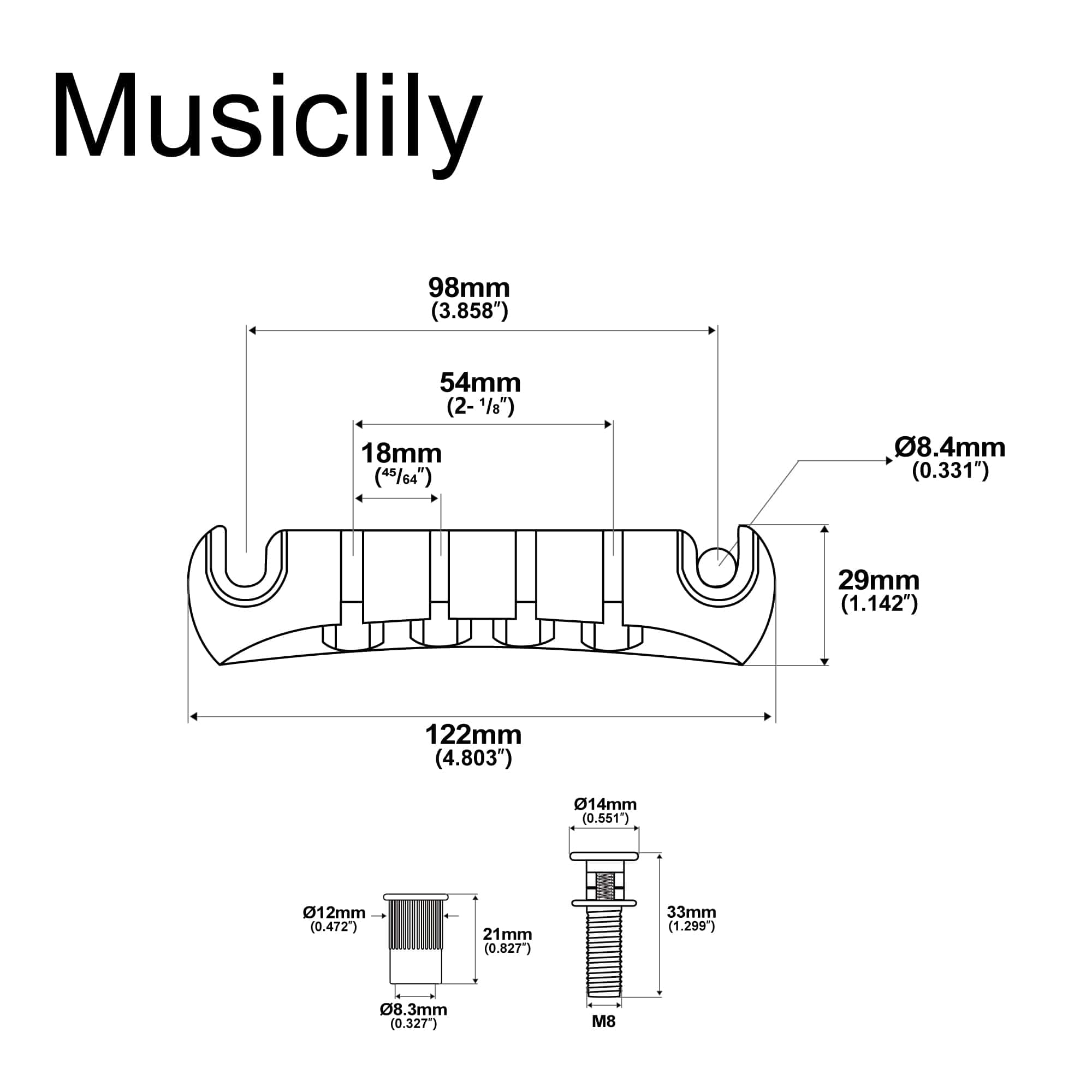 2. Espaciado total de cuerdas: 18×3 54mm (2-1/8 pulgadas), espaciado de pernos de montaje: 98mm (3-55/64 pulgadas), con poste M8 y buje de 12mm de diámetro externo.