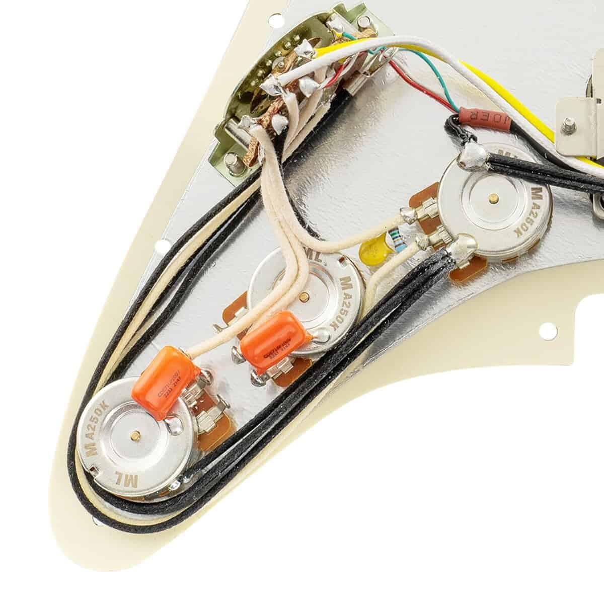 Pickguard pre-cableado Musiclily Pro Auto-Split HSS con Pastillas Artec de Alnico 5 para Guitarra Eléctrica de Estilo ST, ideal para actualizar Squier Strat HSS u otras guitarras de importación de estilo similar, también compatible con la mayoría de las guitarras eléctricas Americanas/Mexico modernas de estilo Strat HSS estándar, lleva tu tono al siguiente nivel. Presenta pastillas Artec con imán de Alnico 5. La pastilla del mástil y la del medio (6.3K/6.5K) tienen piezas polares escalonadas diseñadas para emular las clásicas pastillas de los Stratocaster americanos de los años 60 de Fender, con tonos claros y brillantes, y un auténtico sonido vintage. Pastilla central de bobina inversa y polaridad inversa para eliminar ruidos. La pastilla del puente (16.8K) es una humbucker estándar sin cubrir, de alta potencia, suena gruesa y completa, ideal para overdrive, hard rock o tonos limpios de blues clásico. Construido a mano por técnicos experimentados en nuestra casa, elegimos piezas premium de recursos confiables, nos enfocamos en cada detalle durante el cableado y la prueba, nos enorgullecemos de nuestro trabajo. Viene con la guía del usuario que contiene un diagrama de cableado profesional para resolver tu problema de cableado. El paquete incluye: 1 pieza de pickguard pre-cableada. Pastillas Artec (Mástil/Medio/Puente): Resistencia de 6.3K/6.5K/16.8K, Imán: Alnico 5; Espaciado de piezas polares: 50 mm/52 mm/52.5 mm; Perillas: Ejes estriados de latón completo Serie HD A250K x 3; Interruptor de 5 posiciones y jack de salida de alta resistencia estilo importado de Corea; Capacitor Orange Drop .022 F x 2 y Modificación Treble Bleed; Cableado con ropa estilo vintage de empuje hacia atrás.