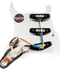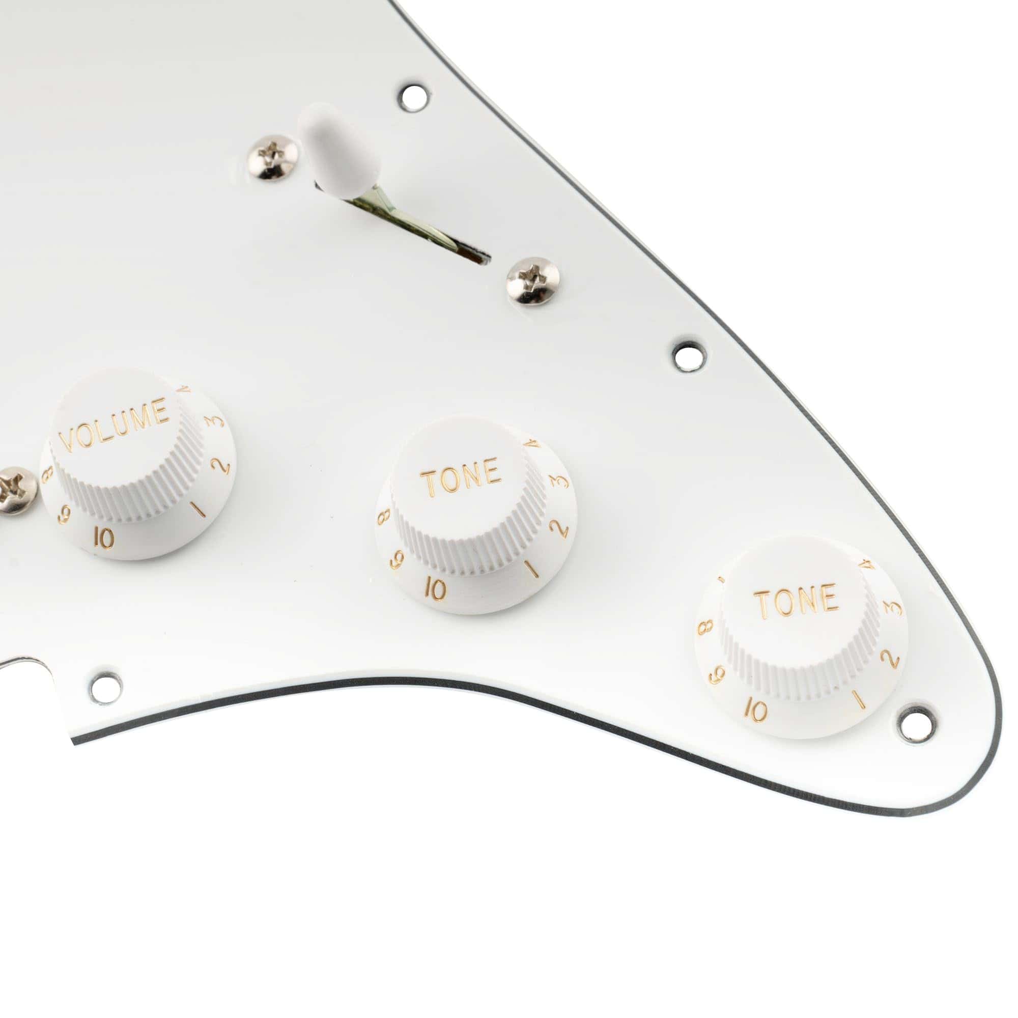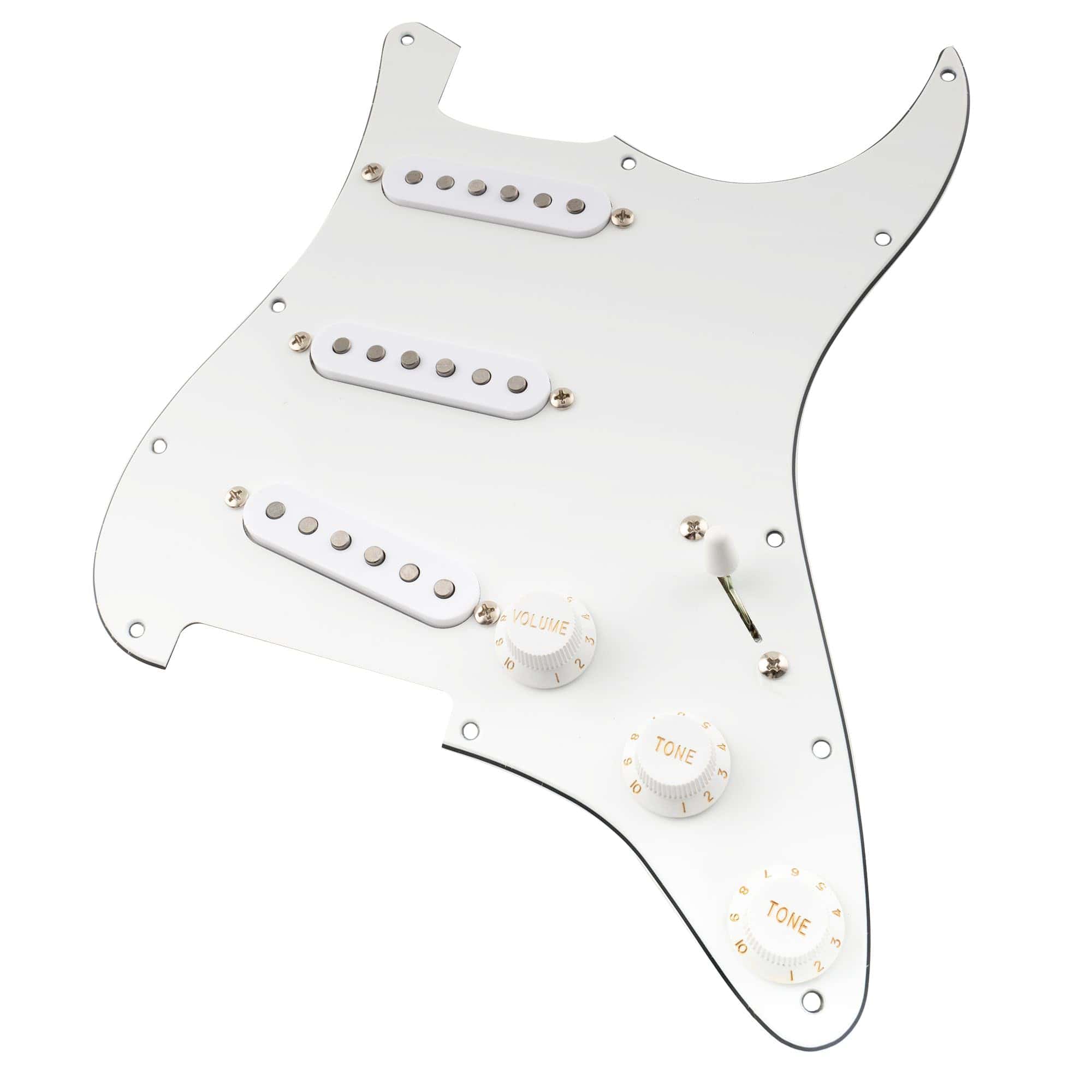 Buena elección para mejorar Squier Strat SSS u otra guitarra de estilo importación similar, también se adapta a la mayoría de las guitarras eléctricas estilo Strat SSS modernas estándar Americanas/Mexicanas, lleva tu tono al siguiente nivel. Con pastillas de bobina simple Artec (6.3K/6.5K/6.5K) con imanes de alnico 5 escalonados, diseñadas para emular las clásicas pastillas Americanas Strat de los años 60 de Fender, con tonos claros y auténtico sonido vintage. Pastilla central invertida y polaridad invertida para la cancelación de zumbidos. Construido a mano por técnicos experimentados en casa, elegimos piezas premium de recursos confiables, nos enfocamos en cada detalle durante el cableado y la prueba, nos enorgullecemos de nuestro trabajo. Viene con la guía del usuario que tiene diagramas de cableado profesionales para resolver tu problema de cableado. El paquete incluye: 1 pieza de pickguard pre-cableado. Pastillas Artec (Cuello/Centro/Puente): Resistencia 6,3K/6,5K/6,5K, Imán: Alnico 5; Espaciamiento de polos: 50mm/52mm/52mm; Pots: Serie HD de eje estriado completo A250K x 3; Interruptor de 5 vías pesado estilo importación Corea y jack de salida; Condensador Orange Drop .022 F y Mod de Atenuación de Agudos; Cableado de estilo vintage de empuje hacia atrás.
