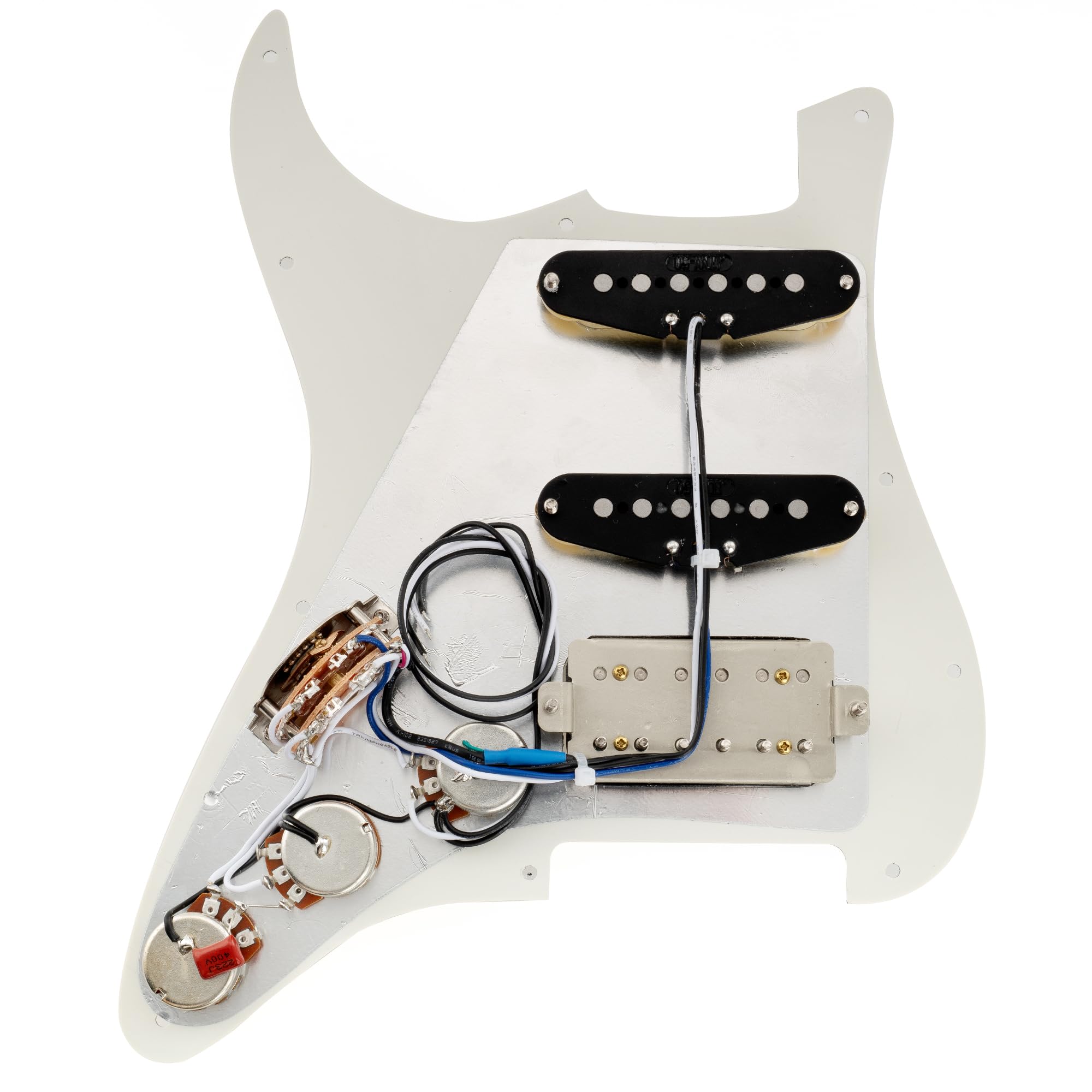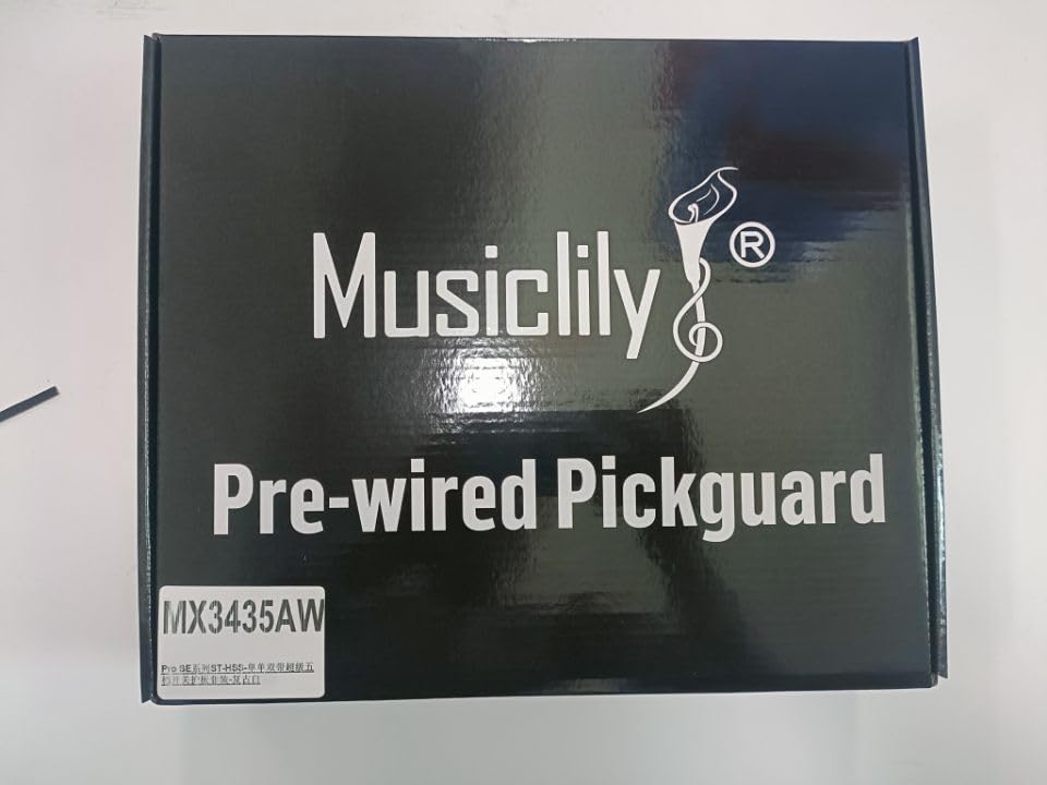 Musiclily Pro ST-HSS-60SE Pickguard precableado standard HSS con pastillas de imán Alnico 5 y switch de 5 vías para guitarra eléctrica estilo ST, 3 capas blanco envejecido. Pastillas de mástil/medio con polos escalonados y magnetos de Alnico 5, tonos estilo vintage, similar a las pastillas F Custom 69 Strat, polos escalonados para una salida equilibrada, pastilla media con polaridad inversa y herida inversa (RWRP) para cancelación de ruido, funciona especialmente bien con pedales. Humbucker de puente descubierto 8.8K, con imanes de Alnico 5. Construido a mano en casa con piezas seleccionadas, atención a cada detalle durante el cableado, prueba adecuada por técnicos experimentados. Incluye guía del usuario con diagrama de cableado profesional para resolver problemas de cableado. Paquete incluye: 1 pickguard precableado. Pastillas (Mástil/Medio/Puente): Resistencia 5.6K/5.6K/8.8K, tolerancia: 0.5K/0.5K/1K, Imán: Alnico 5, Espaciado de polos: 50mm/50mm/52mm; Potenciómetros: A250K(T) x 2 + B250K(V); Interruptor super de 5 vías; Condensador .022uF; Cables de PVC.