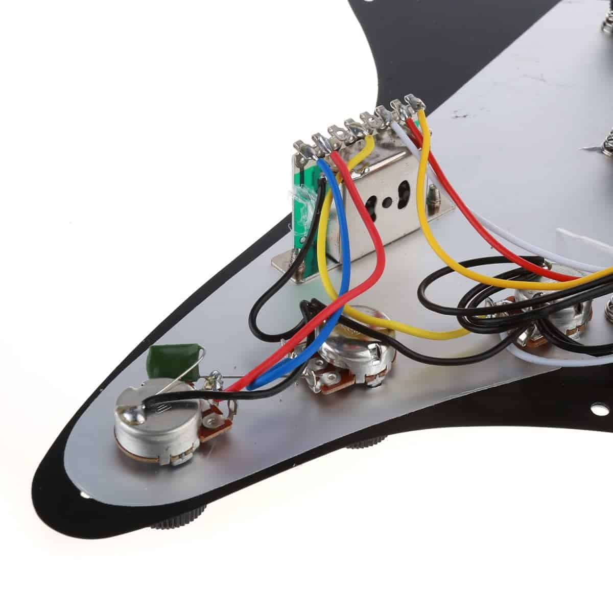 Esta placa de pickguard cargada viene con 3 pastillas single coil para un sonido clásico de stratocaster. Está hecha de 3 capas y el interruptor es de 5 vías con cableado de un control de volumen y 2 de tono. Todo lo que tienes que hacer es soldar el jack de entrada y estarás listo para tocar. Paquete que incluye: 1 x Set de Pickguard Cargado