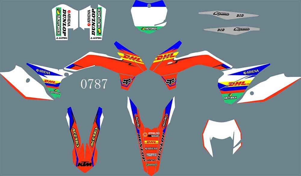 Gráficos incluidos: Calcomanías de carenado del radiador, calcomanías de guardabarros delantero y trasero, calcomanías de horquilla inferior, calcomanías de basculante, fondos de paneles laterales delanteros, izquierdo y derecho