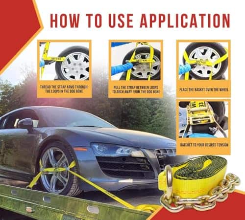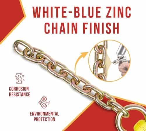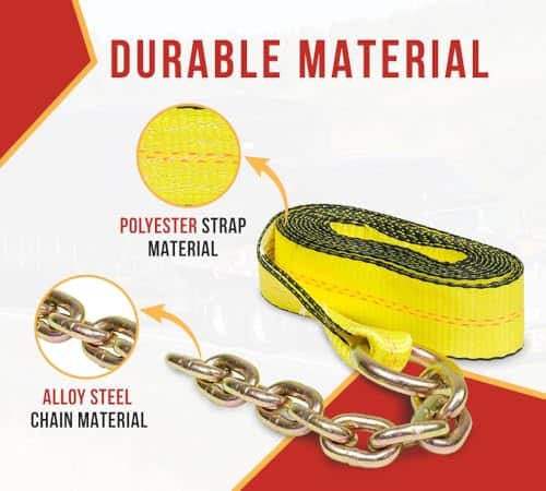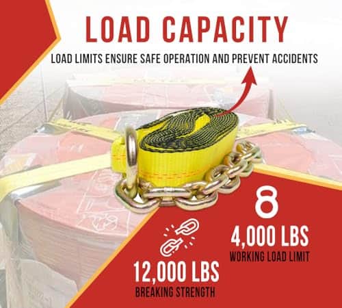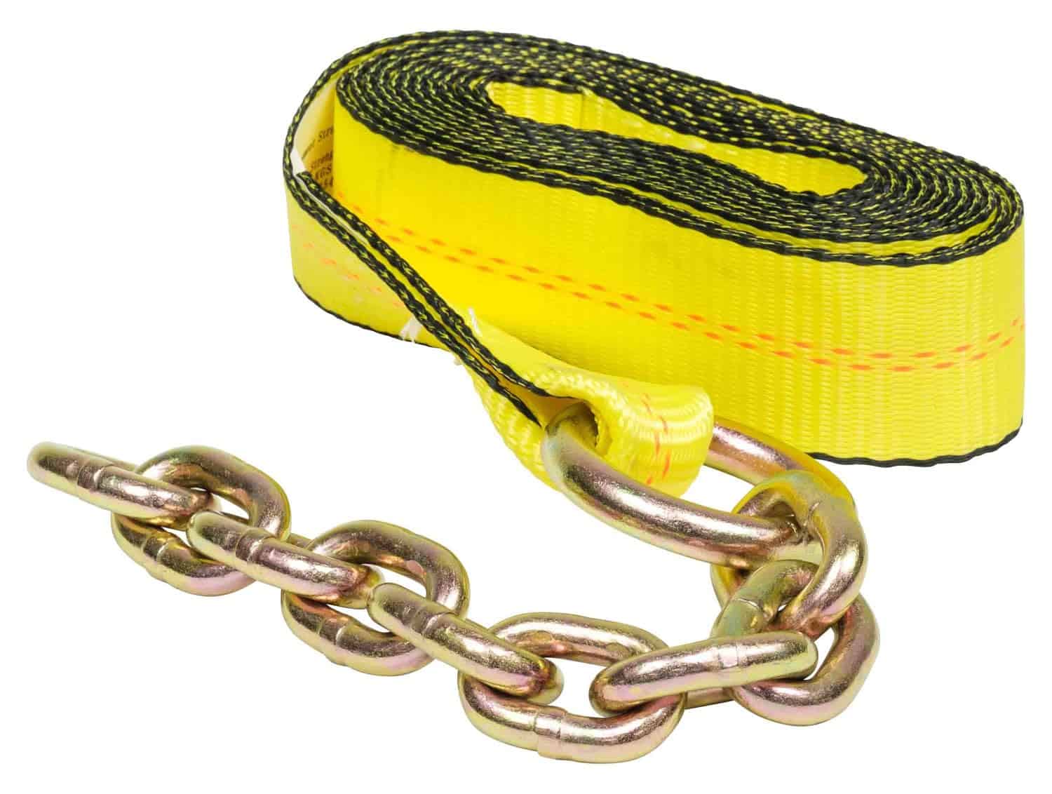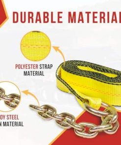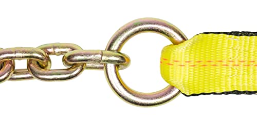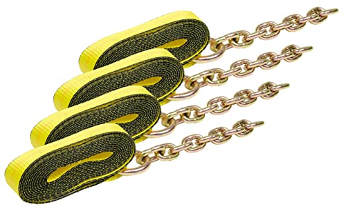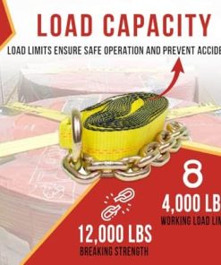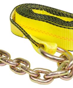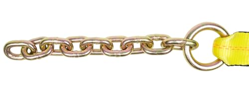 Tamaño del paquete: Paquete de 4 Las Correas de Amarre de Repuesto de Mytee para Kits de Amarre de 8 Puntos Longitud: 14′ Ancho: 2″ Cadena: 3/8″ Límite de Carga de Trabajo: 4,000 lbs Resistencia a la Rotura: 12,000 lbs Correa con Extensiones de Cadena de 3/8″ x 14′ RESISTENCIA A LA ROTURA DE 12,000 LBS. Nuestros amarres de 8 puntos son los más fuertes en el mercado de remolque de autos. Sin importar el tipo de vehículo que necesites remolcar, estas correas pueden manejarlo. Cada correa por sí sola tiene un Límite de Carga de Trabajo (WLL) de 4000 lbs y una capacidad de rotura de 12,000 lbs. CINTAS DE POLIÉSTER DURADERAS. Nuestras cintas están hechas de poliéster duradero. El poliéster apenas se estira bajo cargas pesadas, resiste daños por rozaduras o cortes, y el agua se desliza fácilmente, por lo que no puede crecer moho y arruinarla. EXTENSIONES DE CADENA DE 3/8″ DE PESO PESADO. Nuestras extensiones de cadena cromadas en oro son resistentes a la corrosión, por lo que no se desgastarán por el óxido con el tiempo. Las cadenas están forjadas con una aleación de acero tratada térmicamente, ¡y son suficientemente fuertes para levantar un auto con una grúa! En este caso, sin embargo, vamos a usarlas para asegurar el auto a tu plataforma plana.