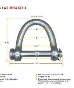 Web Sling Shackle Quick Pin Material: White Blue Zinc Size: 4″ Working Load Limit: 13,000 lbs Estos Web Shackles son la forma más rápida de conectar tu eslinga al ojo en tus correas de recuperación.