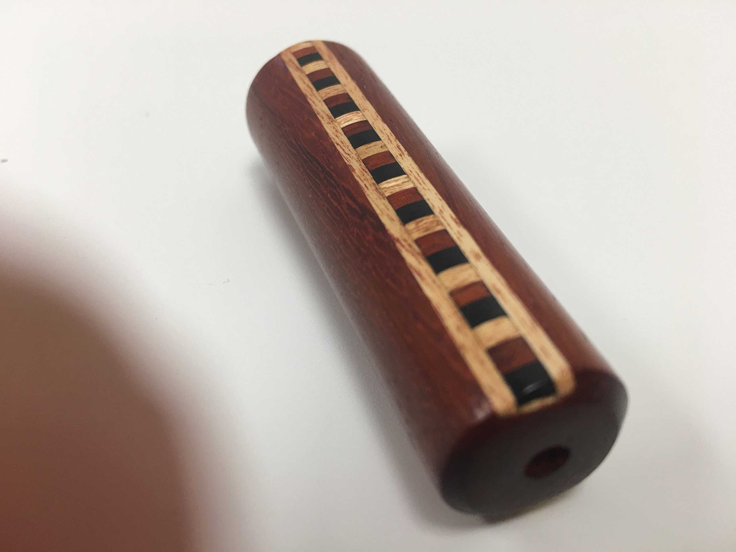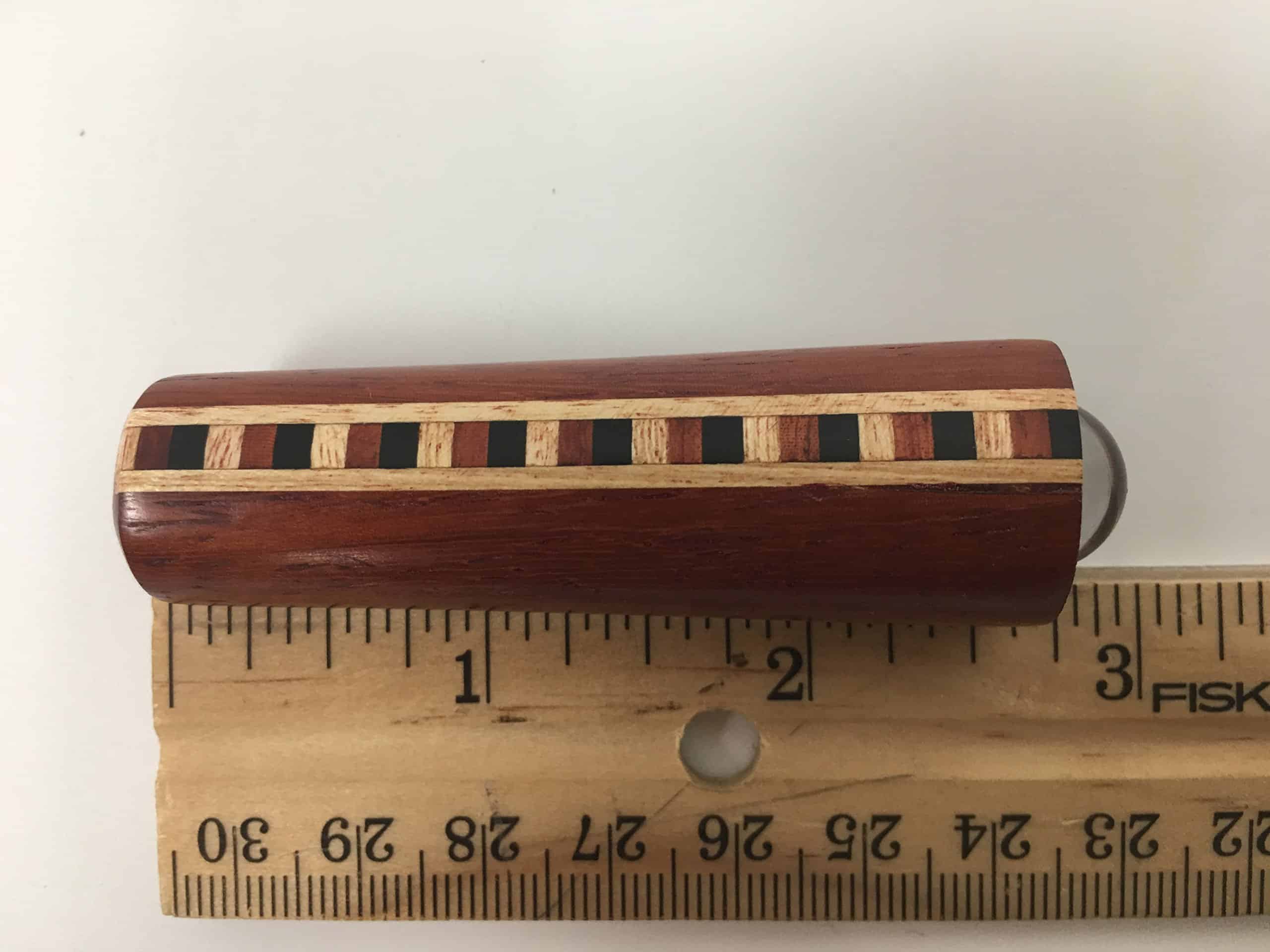 Un Teleidoscopio MINI de Padauk Sólido con una banda de Incrustación de Maderas Duras de Ébano, Jalneem y Padauk, que mide 2 3/4 pulgadas de longitud, ¡ofreciendo mucho que ver! Con un Teleidoscopio, tu vista cambia con todo lo que apuntas, cerca y lejos, ¡resultando en una infinita variedad de colores y formas! Hecho a mano en EE. UU. por N & J. ESTOS SON PEQUEÑOS COMO IMPLICA EL NOMBRE «MINI». ¡ESTE ES UN GRAN TELEIDOSCOPIO DE TAMAÑO DE BOLSILLO BIEN FABRICADO!