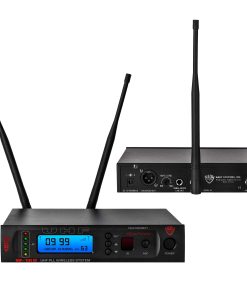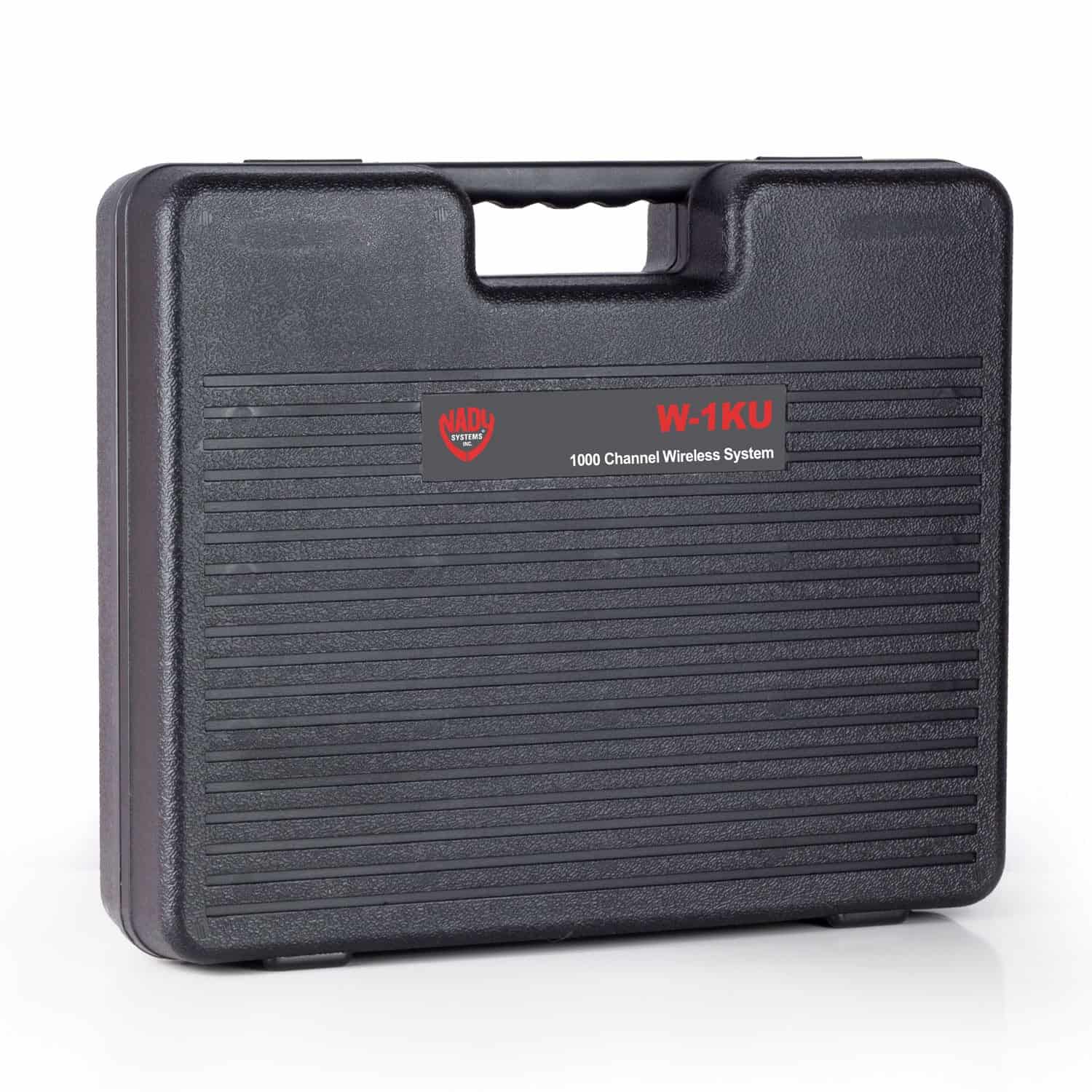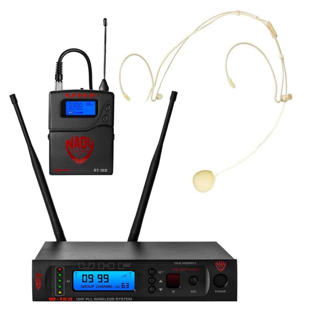 4. Transmisor de cuerpo con cuerpo completamente metálico con el micrófono de diadema omnidireccional Nady HM-10 y clip para cinturón. La pantalla LCD indica el grupo, el canal, el nivel de audio y el estado de la batería. Funciona con dos pilas AA. Contenido de la caja: receptor W-1KU, transmisores de cuerpo BT-1KU LT inalámbricos, micrófono de diadema HM-10, estuche resistente acolchado con espuma, adaptador de CA, dos antenas BNC extraíbles, guía del usuario, carta de frecuencia.
