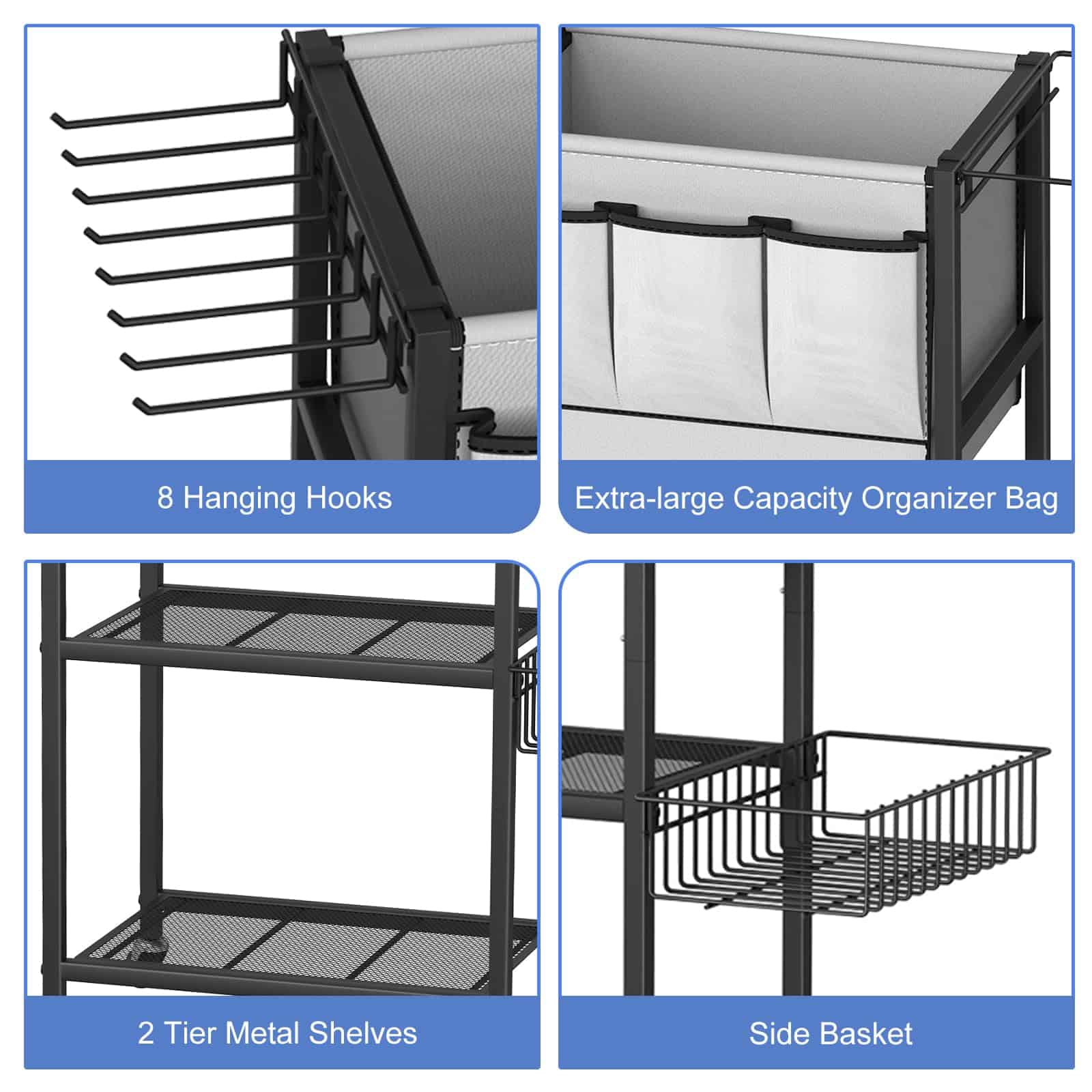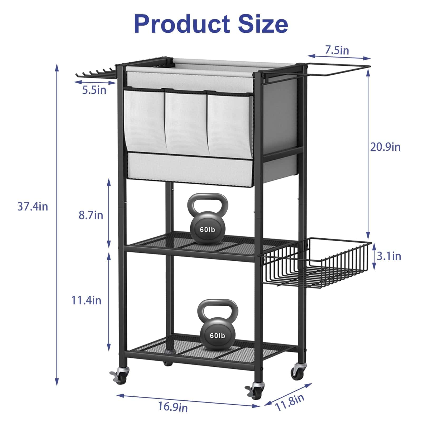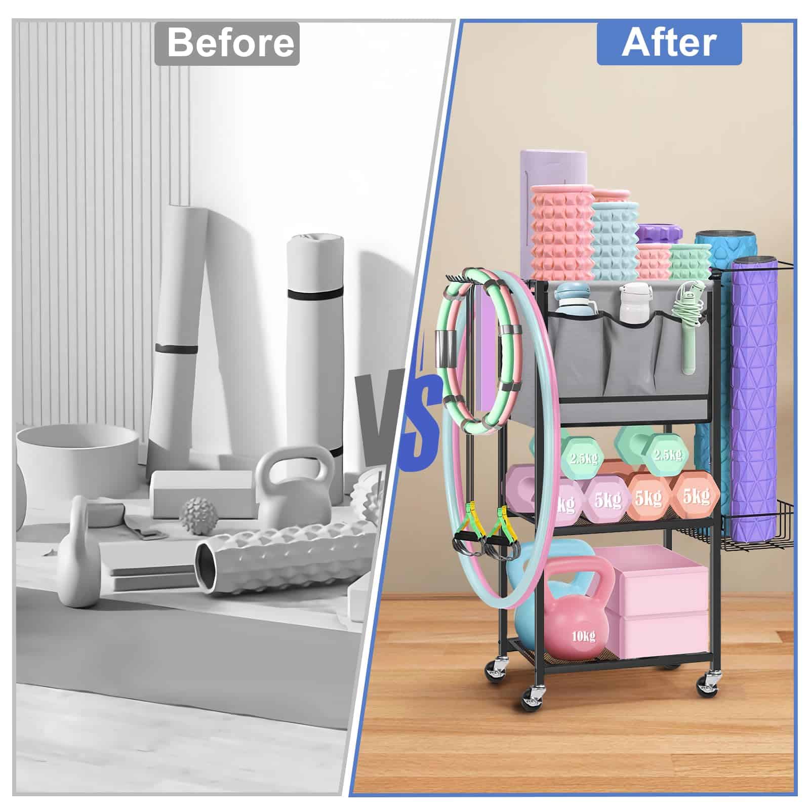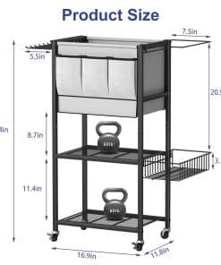 2. Diseño de Almacenamiento de Gran Capacidad: Este soporte de almacenamiento para equipo de entrenamiento viene con 2 niveles de malla metálica y un área de almacenamiento de bolsa de tela extragrande, un cesto lateral, una fila de 8 ganchos laterales y ruedas móviles bloqueables de 360 grados. Puede organizar eficazmente diferentes tamaños de tapetes de yoga y accesorios de fitness para satisfacer sus necesidades de colocar equipos de fitness.