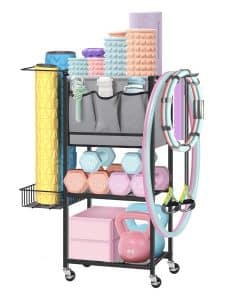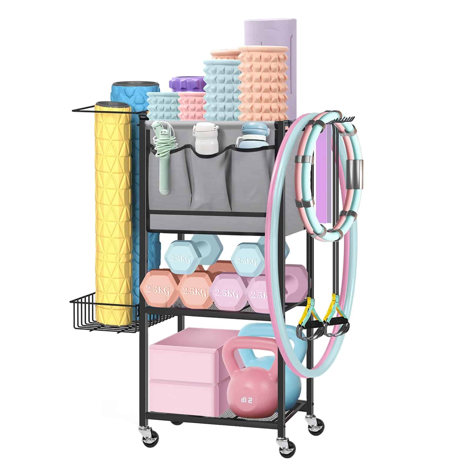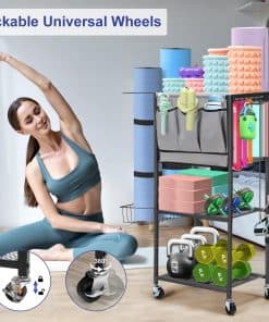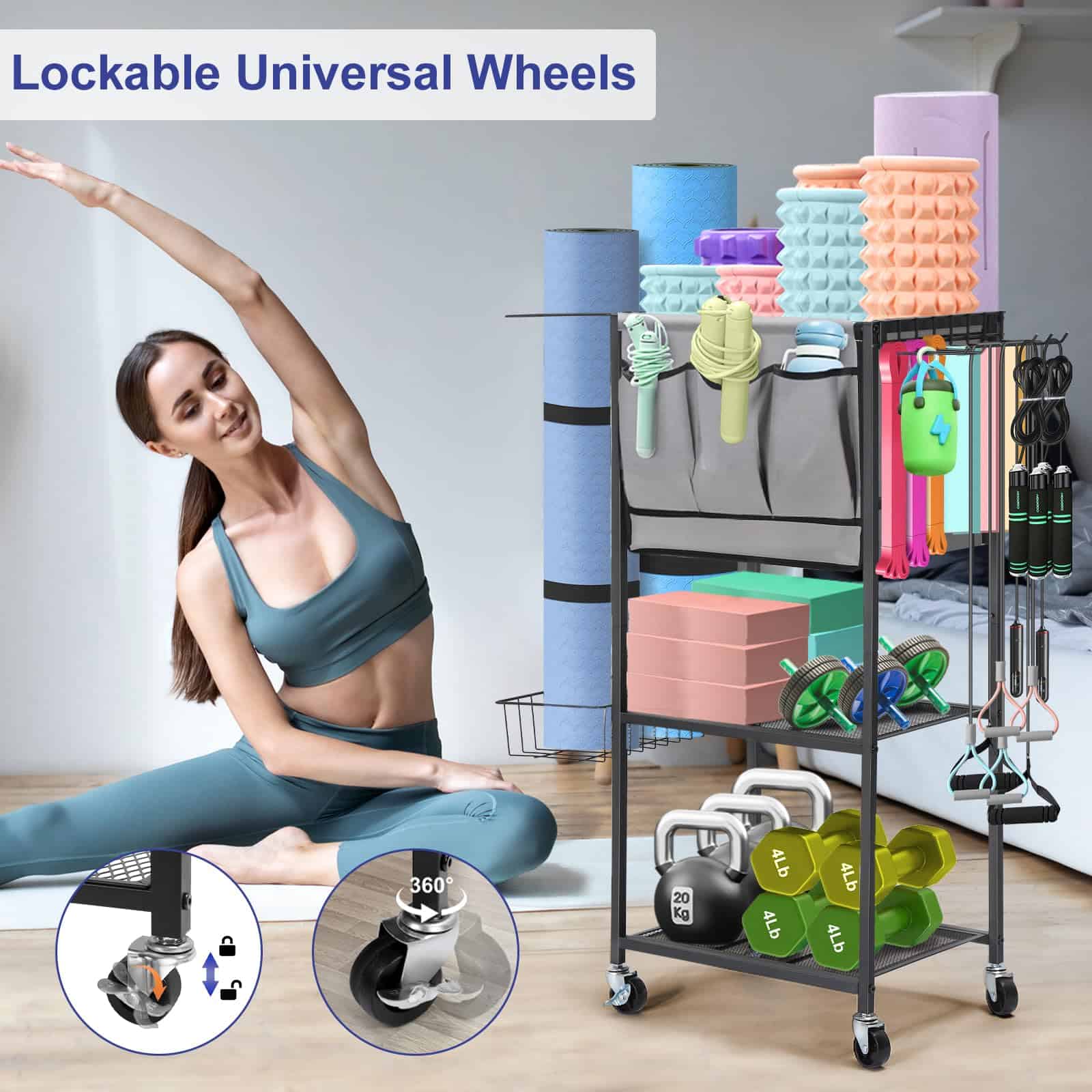 4. Ruedas y Ganchos Bloqueables de 360 Grados: El soporte de almacenamiento para gimnasio en casa tiene 4 ruedas universales (2 de ellas bloqueables), es conveniente para mover el carrito de rodillos de espuma y usar el equipo deportivo. Hay ganchos desmontables en los lados para colgar toallas, bandas de resistencia, ruedas de yoga y más.