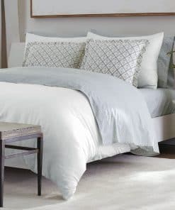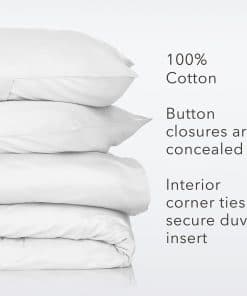 Shop the Look: Estos son los artículos adicionales mostrados en la foto de estilo de vida; Sábanas de percal de algodón con estampado de bloque en aqua pálido; Cojín de trellis estampado en gris oscuro; Detalles finos: las esquinas atadas mantienen la ropa de cama en su lugar; Cierre de botones ocultos que no se enganchan; Las fundas de almohada tienen un cierre de solapa central de 4 pulgadas para mantener las almohadas guardadas; Crear tu historia única: la paleta de colores neutros crea la base perfecta para la ropa de cama; Los detalles en la ropa de cama añaden un toque elegante a tu dormitorio; Material + Cuidado: Hecho de algodón premium al 100% con un tejido de satén y 300 hilos; Lavable a máquina; Siga las instrucciones de cuidado para obtener los mejores resultados; Certificado MADE IN GREEN por OEKO-TEX, fabricado en instalaciones respetuosas con el medio ambiente; Medidas: Funda nórdica 110″ x 96″; Cada funda de almohada king grande 20″ x 36″