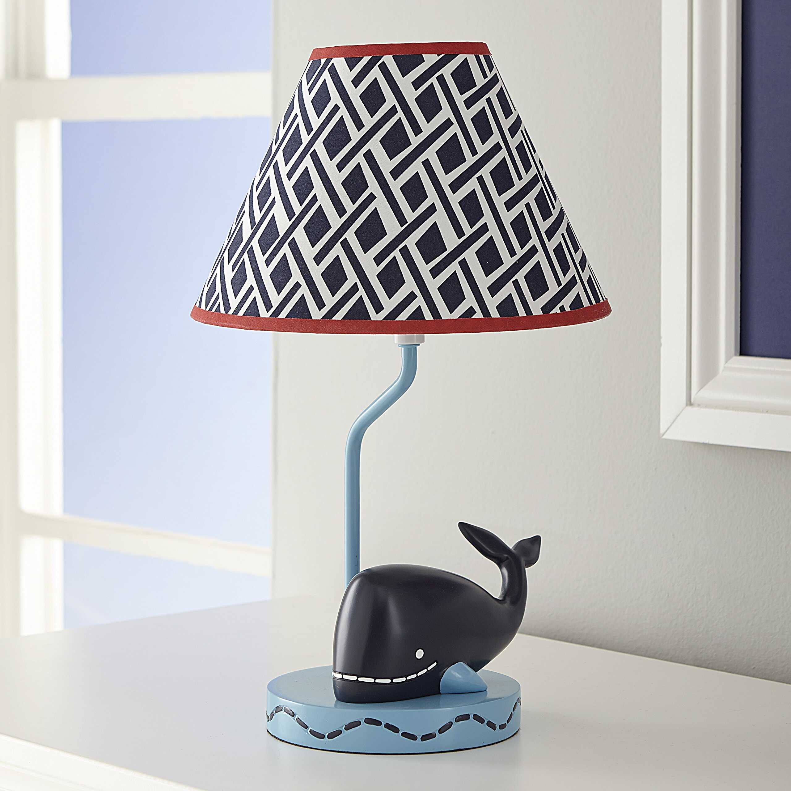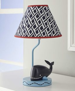 Nautica Kids – Whale of a Tale – Lámpara y Pantalla. Base de resina azul claro con ballena de resina en 3D y pantalla de lámpara de tela estampada. Lámpara certificada por UL e incluye una bombilla de bajo consumo. La lámpara mide aproximadamente 15 pulgadas de alto. Los colores son azul marino, azul claro y blanco con un toque de rojo. Máximo de 40 vatios. Bombilla incluida. Coordina con la colección de ropa de cama Whale of A Tale.