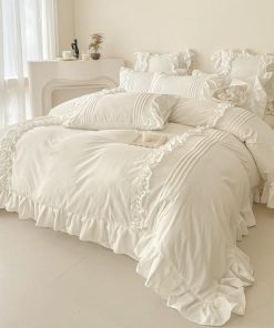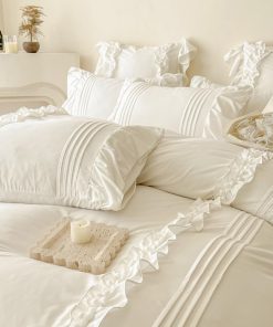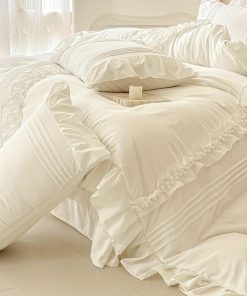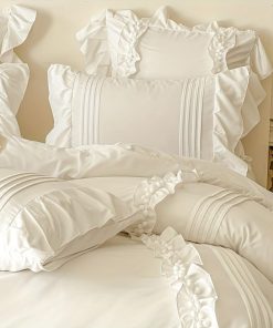 Este juego de ropa de cama adornado con volantes encantadores y pompones que crean un ambiente acogedor e invitador, agregando un toque de elegancia y suavidad a la decoración de tu dormitorio.