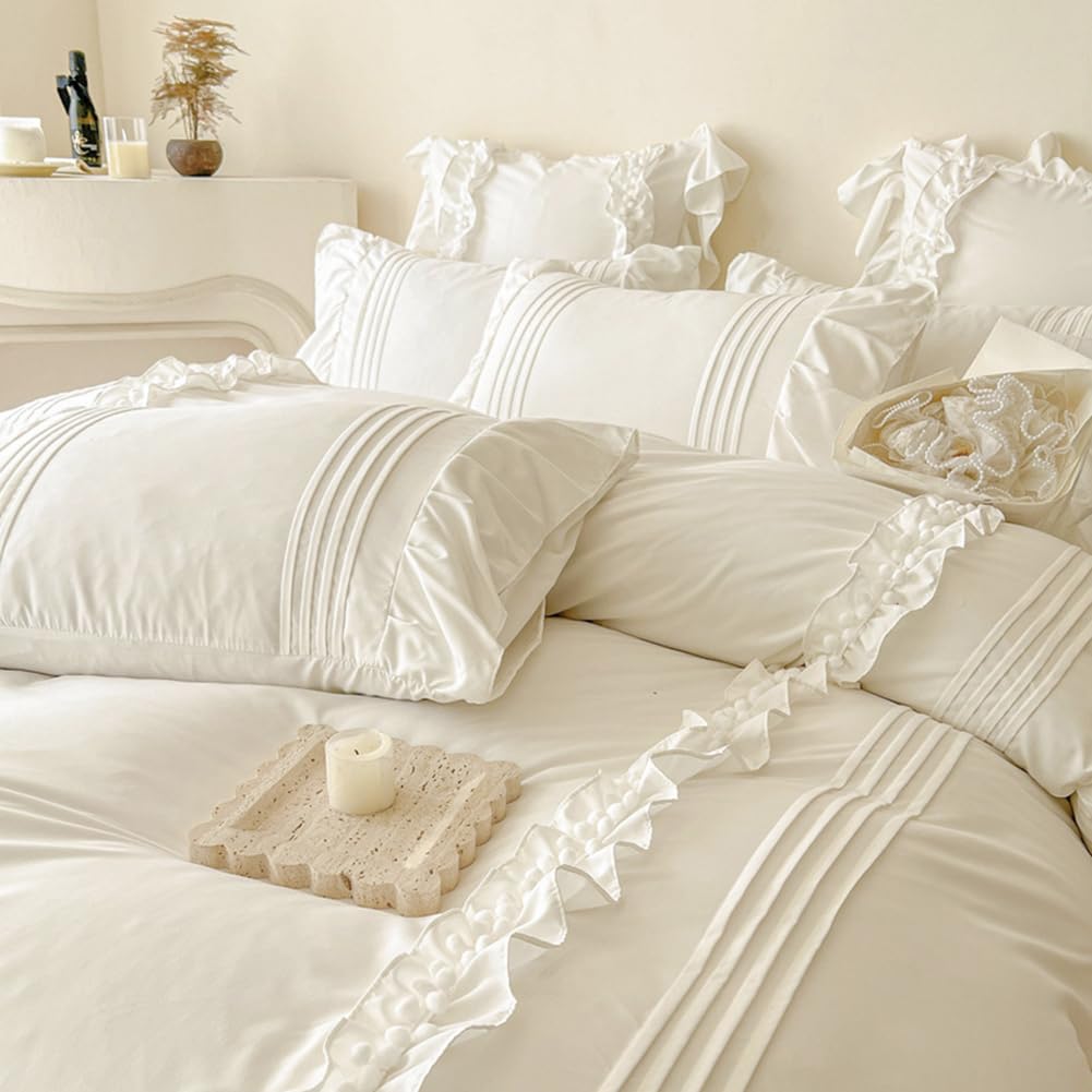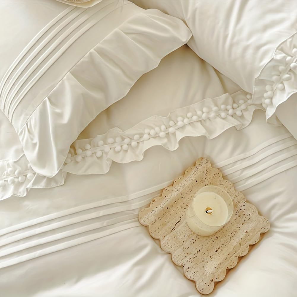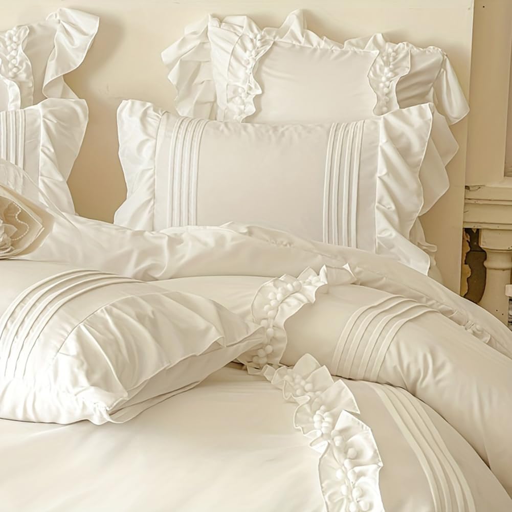 Juego de Funda de Edredón Blanco Nayoroom con Volantes y Pompones Ruffle Shabby Chic Juego de Ropa de Cama 3 Piezas para Niñas Elegante Estético Cubierta de Edredón Suave Transpirable de Microfibra Lavada