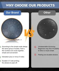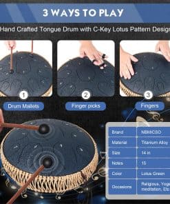 El tambor de lengüeta de acero NBMICSO es un instrumento de percusión único que ofrece tonos limpios y etéreos que pueden purificar la mente y el alma. Fabricado con materiales de alta calidad y artesanía meticulosa, este tambor de acero de 15 notas en clave de Do proporciona un sonido rico y armonioso que es perfecto para la meditación, el entretenimiento, la educación musical, los conciertos, la sanación mental y el yoga. Con sus 13 notas y su diseño de sonido ‘baño de alma’, este tambor de lengüeta es adecuado para una amplia gama de usos, incluida la música educativa, el yoga, la meditación, el tono zen, la rehabilitación espiritual, el sueño y la oración, el acompañamiento de conciertos y la iluminación infantil. Además, es un regalo ideal para los niños, ya que fomenta el desarrollo auditivo y visual, potencia cerebral, memoria, confianza, paciencia, habilidades sociales y la creatividad. El tambor de lengüeta de acero NBMICSO viene con un completo kit de instrumentos que incluye un tambor de lengüeta de acero de 14 pulgadas, una bolsa de tambor, 2 baquetas, 1 partitura, 1 notas de repuesto, 4 almohadillas para dedos y 2 pegatinas de notas, todo lo necesario para empezar a disfrutar de la música y experimentar los sonidos celestiales de este tambor único.