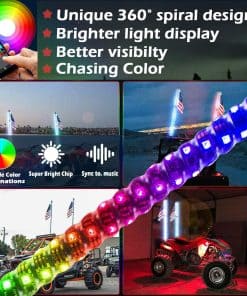Características: 1. Látigo LED con un diseño único de danza en espiral (caza) 2. Control Bluetooth y sincronización perfecta 3. Base de resorte de cobre y acero inoxidable 304 4. Tubo resistente, fácil de instalar con una base de conexión rápida 5. Impermeable, anti-frío y anti-golpes.
