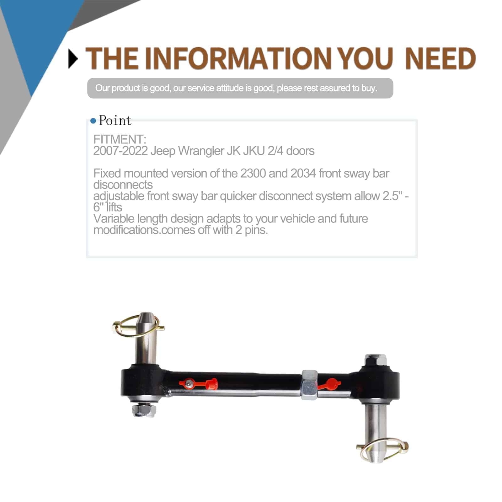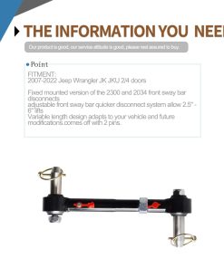 Gran Mejora en el Rendimiento Todoterreno Cuerpo Fileteado Ajustable para Adaptarse a tu Vehículo Sistema de Desconexión Rápida de Barra Estabilizadora Delantera Beneficio: Ayuda a estabilizar el cuerpo del vehículo en relación con la suspensión.