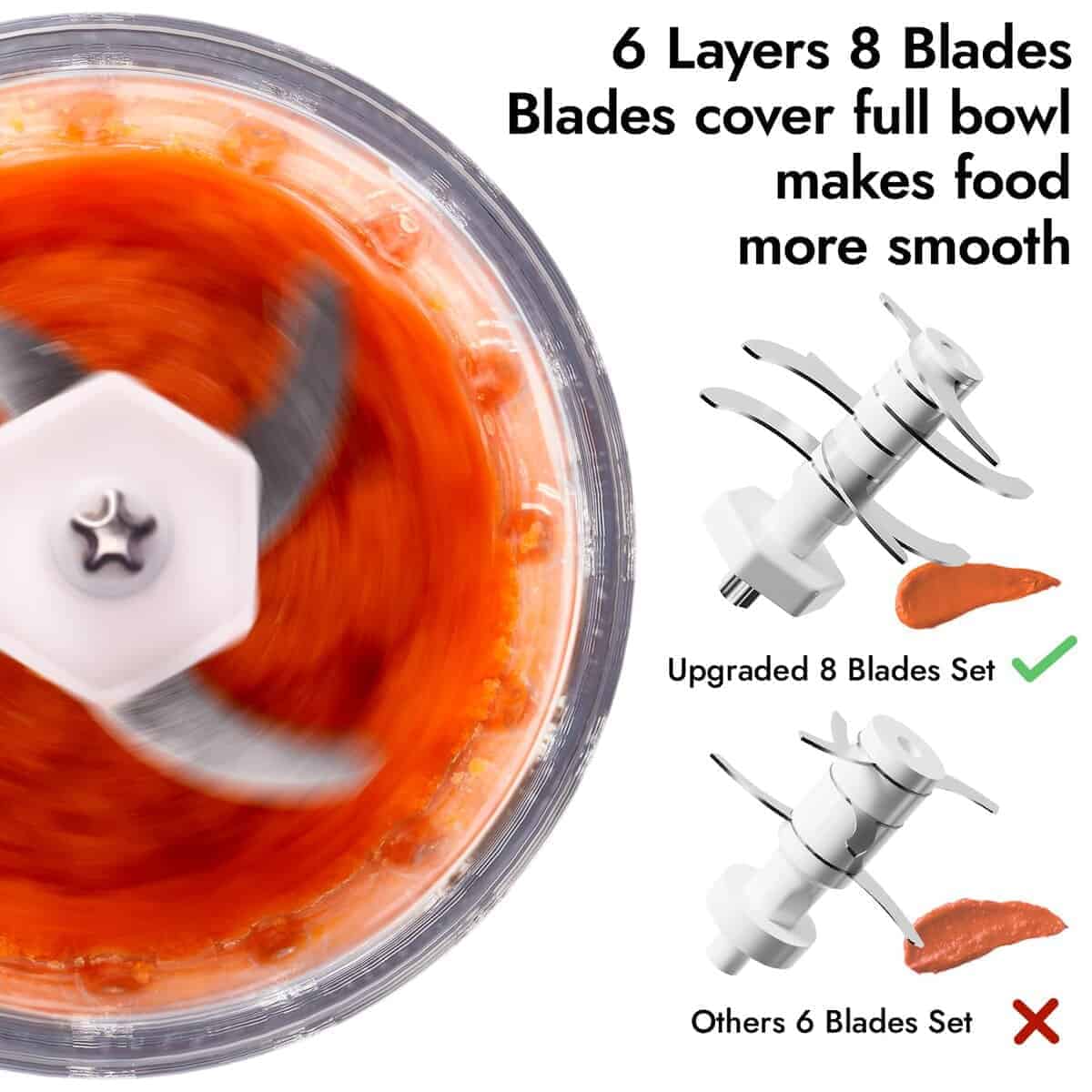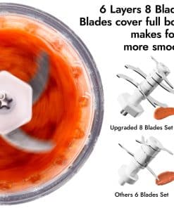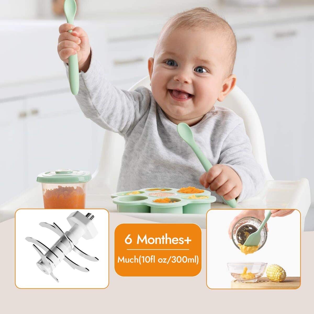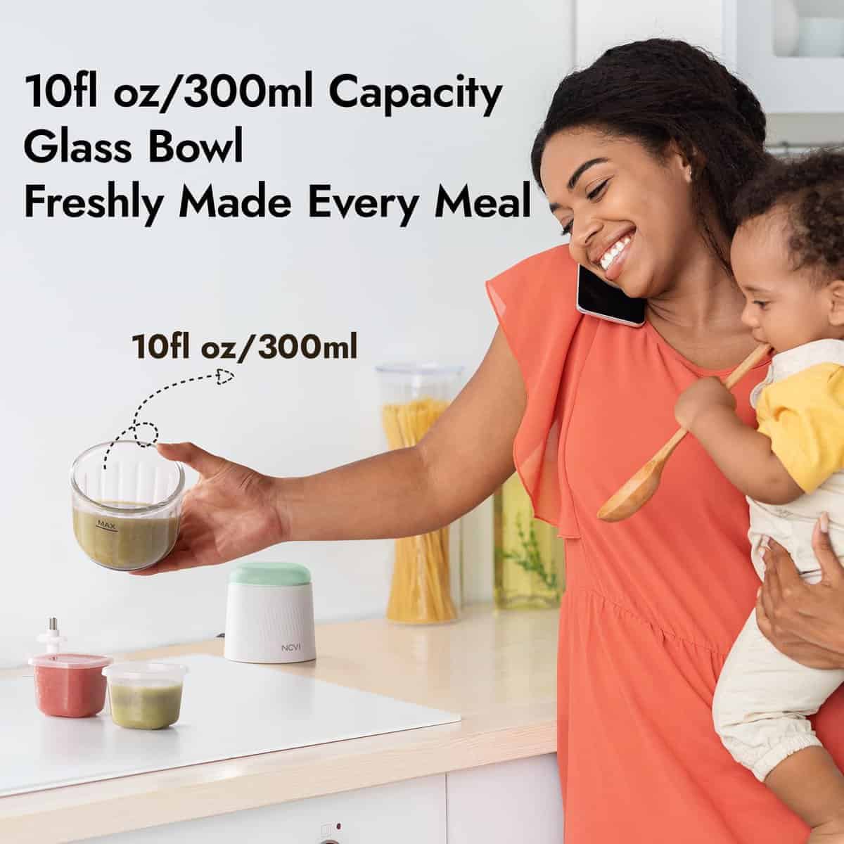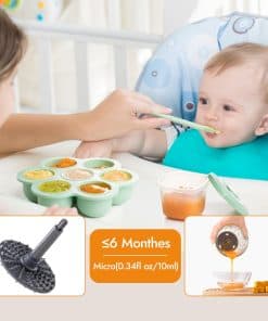 1. ¿Qué incluye la caja? El procesador de alimentos para bebés NCVI incluye 1 molino de alimentos para bebés, 6 contenedores de almacenamiento de alimentos para bebés, 1 bandeja para congelador, 2 cucharas de silicona, 1 espátula de silicona y 1 cepillo. Un set ayuda a los nuevos padres a resolver todos los problemas de los alimentos para bebés. 2. Puré ultra suave con 8 afiladas cuchillas de acero inoxidable 304 y un motor potente, los alimentos para bebés se harán en segundos por el procesador de alimentos para bebés. El recipiente de vidrio del molino y las 8 cuchillas aseguran una mezcla más delicada de los alimentos. Más seguro para los bebés. 3. Fácil de usar y limpiar Pulsar para iniciar, soltar para detener. La tapa de mezclado separa el bol de mezcla del cuerpo de la máquina, haciendo que la mezcla de alimentos sea más segura e higiénica. El bol de mezcla, las cuchillas y la tapa son todos desmontables para una limpieza fácil. 4. Seguro y protección El molinillo de alimentos para bebés NCVI está hecho de materiales seguros de alta calidad, incluyendo silicona apta para alimentos, acero inoxidable 304 de alta calidad, vidrio de borosilicato y libre de BPA. Cuando se inclina, se suelta el botón o se sobrecalienta, la máquina se apagará automáticamente para garantizar la seguridad. 5. Adecuado para varios ingredientes El procesador de alimentos para bebés en puré hace posible mezclar varias frutas frescas, verduras, leche materna y carnes para bebés. Recetas adicionales y bandejas congeladas ayudan a los nuevos padres a preparar alimentos que atraen a los bebés.