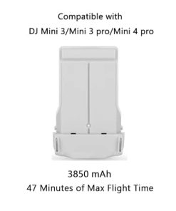 Peso: Aproximadamente 121 g. Capacidad: 3850 mAh. Voltaje: 7.38 V. Límite de Voltaje de Carga: 8.5 V. Tipo de Batería: Li-ion. Energía: 28.4 Wh. Potencia Máxima de Carga: 58 W. Tiempo de Carga: 101 minutos (con el Cargador USB-C de 30W y la batería montada en la aeronave). Temperatura de Carga: 5 a 40 grados C (41 a 104 grados F). Compatible con el Drone DJI Mini 3/Mini 3 Pro.