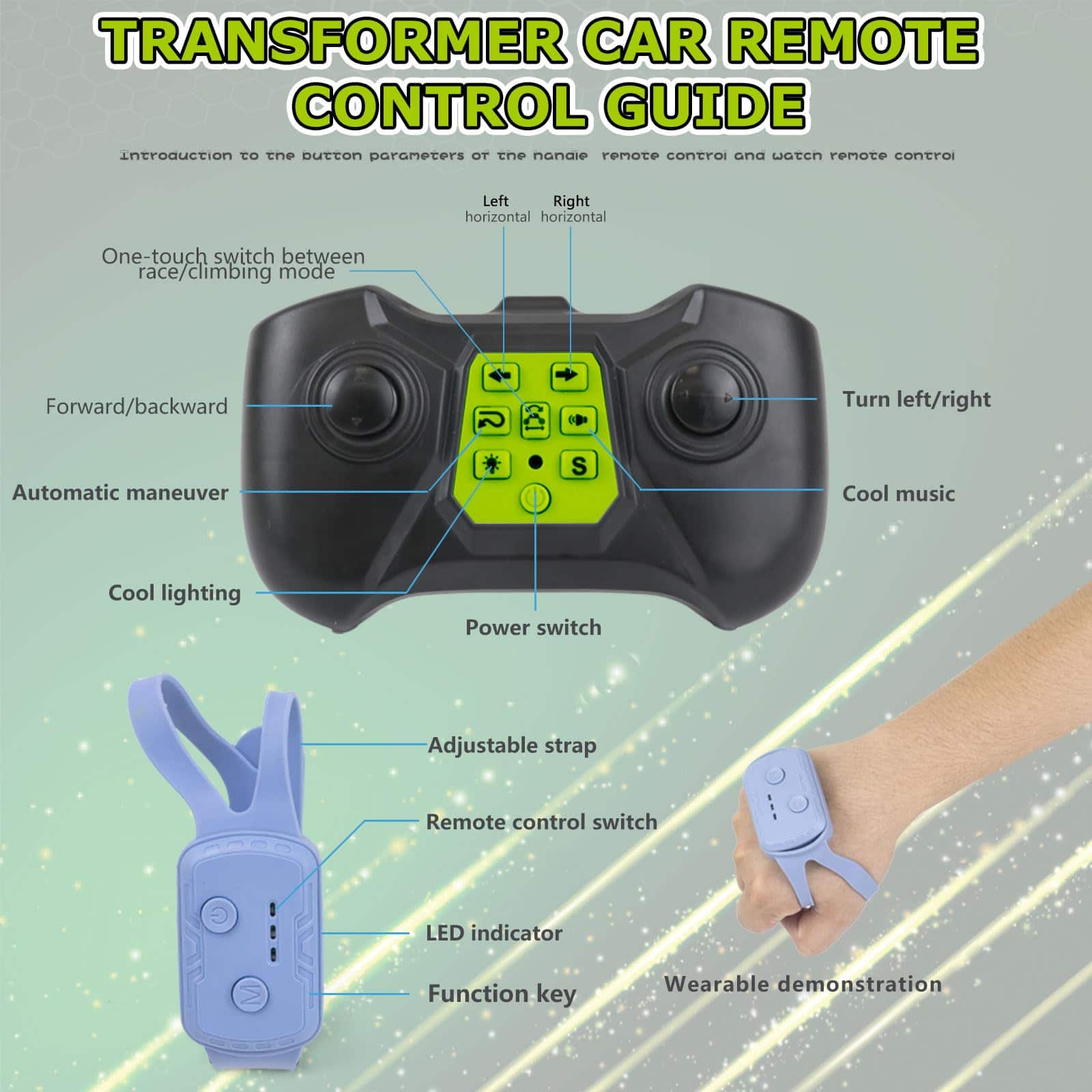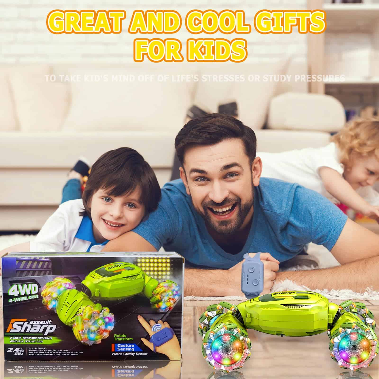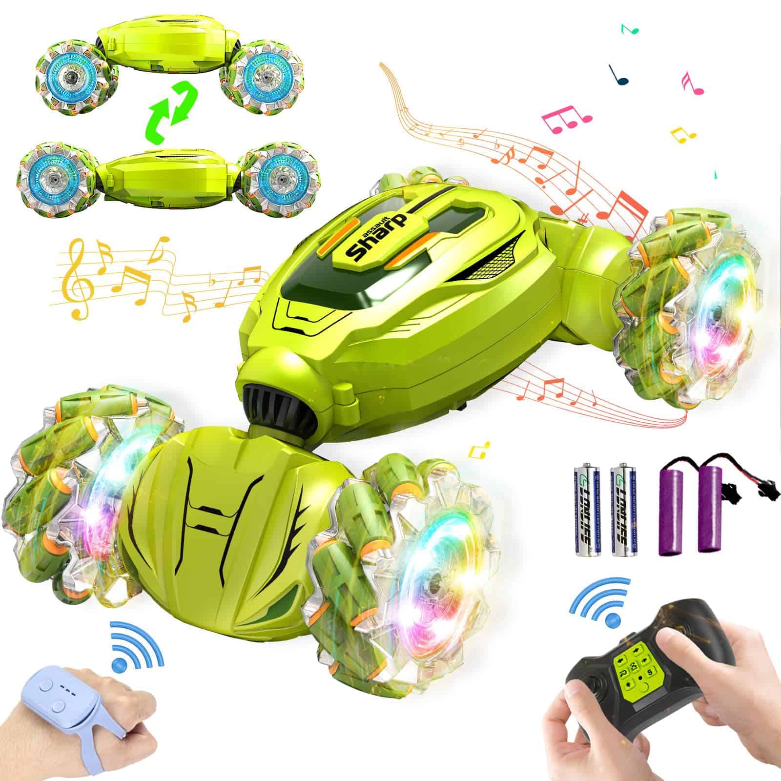 Coches de acrobacias RC para niños con sensor de gestos y control remoto. Este coche de acrobacias RC con sensor de gestos está equipado con luces geniales y música dinámica, que pueden realizar rotación de 360 , caminar de costado, deriva en todas direcciones, conducción de doble cara y otras funciones. El diseño de articulación biónica facilita el cambio del modo de carretera al modo todoterreno, brindándote una emocionante experiencia de carreras. Los geniales coches de acrobacias RC son excelentes juguetes para niños de 6 a 8 años. Este juguete de coche RC para niños de 8 a 10 años adopta la tecnología de transmisión de 2.4GHz, equipado con dos modos de control: gestos y control remoto. Ponte el reloj sensor y cambia el gesto, el coche transformable cambiará de forma en consecuencia, sintiendo el mágico control de gestos. También puedes usar el control remoto para un control preciso, para satisfacer diferentes necesidades de juego. El juguete de coche de control remoto para niños de 8 a 12 años está equipado con dos baterías recargables para extender el tiempo de juego, y puedes cargarlo fácilmente en casa u otros lugares usando USB. Además, el control remoto usa dos baterías AA de 1.5V (incluidas) y el control remoto por gestos usa dos baterías AAA de 1.5V (incluidas). Equipado con neumáticos de múltiples rodillos de doble cara, los regalos de coche de control remoto para niños de 6 años pueden adaptarse fácilmente a una variedad de terrenos incluyendo desiertos, grava, césped, carreteras, playas y más. Incluso puede subir algunas pendientes, perfecto para que los niños jueguen al aire libre. Como un genial coche de acrobacias RC con sensor de gestos, es el mejor regalo para niños de 6 a 12 años, así como un regalo ideal para hijos, hijas, nietos o hermanos, ya sea para cumpleaños, el día del niño, Halloween, Pascua, Navidad o Año Nuevo