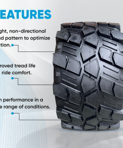 Neumático de tracción no direccional TR-34 para aplicaciones de tractor de jardín y cortacésped que requieren máxima tracción con una carcasa resistente de 6 capas. Diseño con nervio central estrecho para mayor comodidad de conducción y profundos bloques de tracción no direccionales para una máxima tracción en ambas direcciones. Bloques centrales entrelazados optimizan el desgaste del dibujo en superficies duras. Diámetro total 17.9″, Ancho de sección 8″, Max PSI 32, Carga máxima 935 lbs @20 MPH. Carcasa resistente de 6 capas.