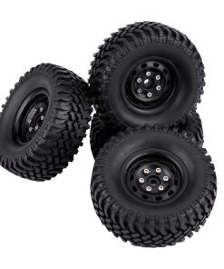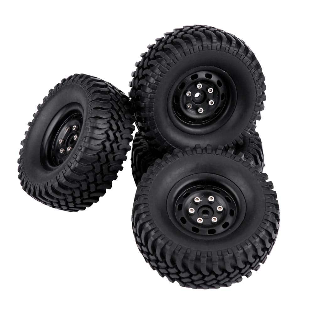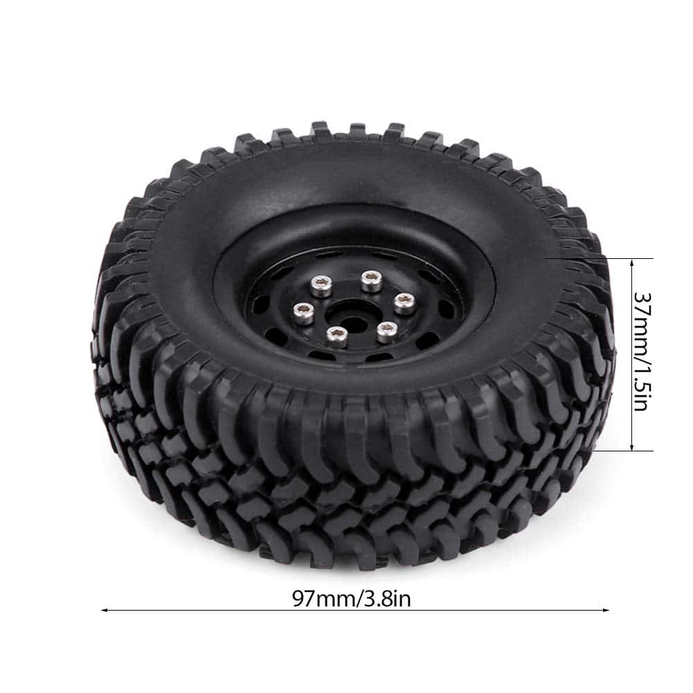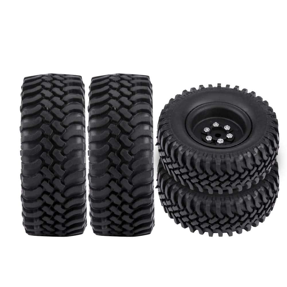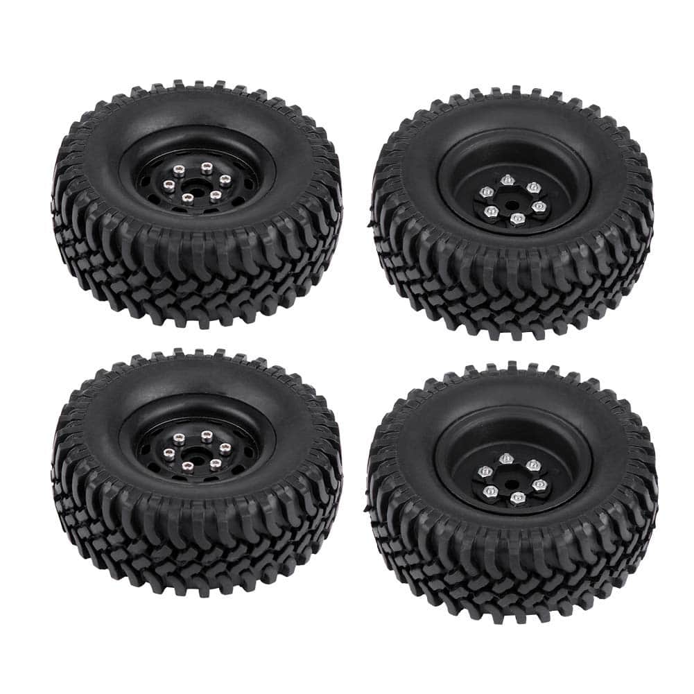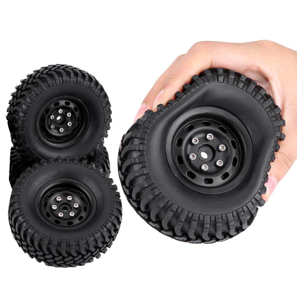 Neumáticos para RC Crawler de alta calidad, duraderos y fáciles de instalar. Superficie antideslizante que proporciona una fuerte capacidad de agarre en la carretera. Accesorio excelente para tu modelo de coche favorito. Fabricados con material de goma resistente, son fuertes, resistentes al desgaste y a los impactos. Tubo interno de esponja resistente a los golpes y de larga vida útil. Adecuados para coches RC crawler a escala 1/10. El paquete incluye 4 neumáticos para RC (incluyendo 4 cubos).
