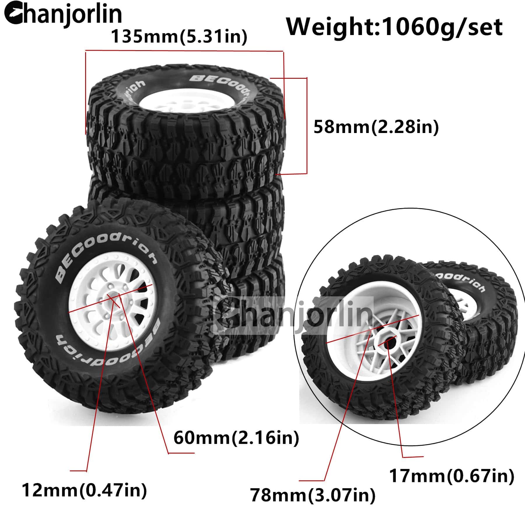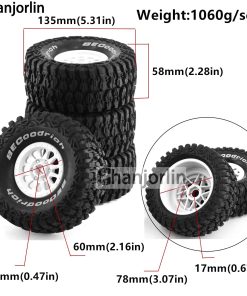 El tamaño de los neumáticos de camioneta corta rc 1/7 1/8, Diámetro Exterior: 135 mm (5.31 pulg.), Diámetro Interior: 78 mm (3.07 pulg.), Ancho: 58 mm (2.28 pulg.), Hexágono de manejo: 17 mm (0.67 pulg.). Es para el equilibrio perfecto entre la apariencia a escala y el rendimiento. Estos neumáticos de coche rc buggy 1/8 1/7 están diseñados para coches rc de camión corto o coche rc todoterreno. Estos neumáticos de camioneta rc son de excelente mano de obra y estilo perfecto.