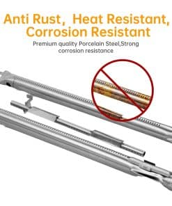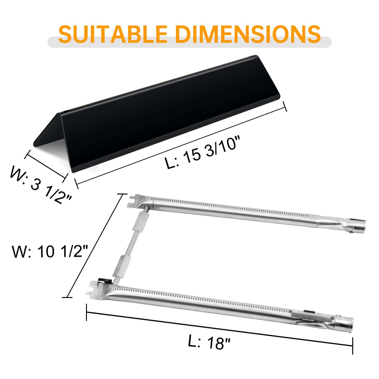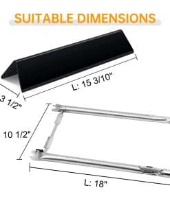 Dimensiones: Barras Sazonadoras 15 1/4″ x 3 1/2″, juego de quemador de parrilla de acero inoxidable 69785. El juego de quemador incluye dos quemadores principales que miden 17 15/16 pulgadas y el cruce tiene una longitud de 10 1/2 pulgadas.