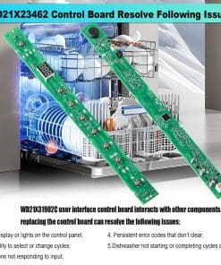 Gracias a esta tarjeta de control de interfaz de usuario de lavavajillas, podrá resolver fácilmente problemas comunes, como la falta de visualización en el panel de control, la incapacidad para seleccionar o cambiar ciclos, botones que no responden a la entrada, códigos de error persistentes que no se borran y problemas de inicio o finalización de ciclos incorrectos.