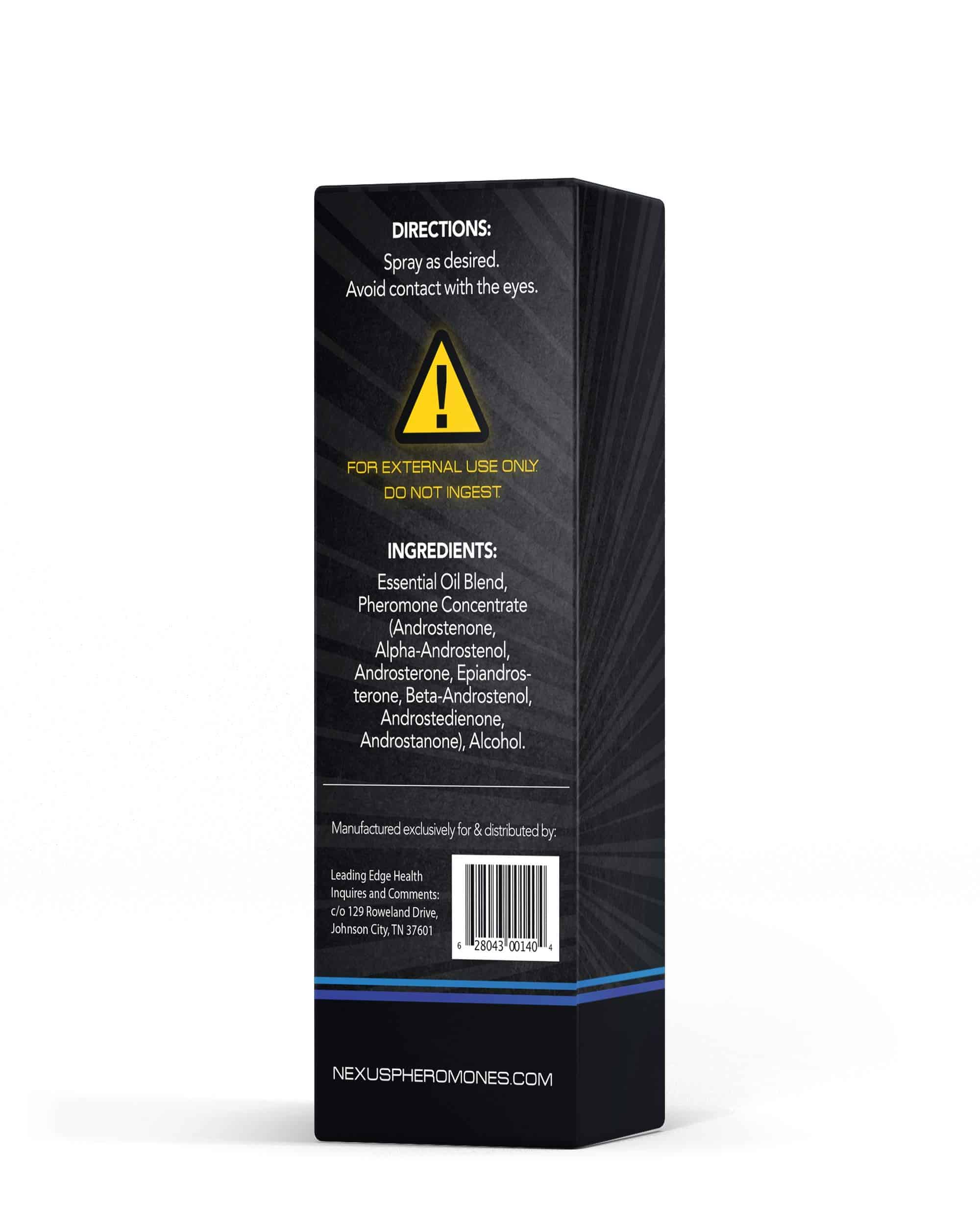 Nexus Pheromones ofrece los elementos químico-hormonales esenciales para comunicar sutil pero inequívocamente tu poder masculino. Simplemente aplica Nexus Pheromones en tus puntos de pulso como aplicarías cualquier colonia, incluso puedes mezclarlo con tu loción para después de afeitar existente si lo deseas. Solo de 1 a 3 sprays producirán resultados durante aproximadamente 8-10 horas. Concentrado de Feromona de Androstenona Pura al 100%. Algunos clientes informaron haber recibido una botella dañada o defectuosa. En caso de que esto ocurra, puedes solicitar un reembolso o reemplazo sin hacer preguntas. Los resultados pueden variar de un cliente a otro.